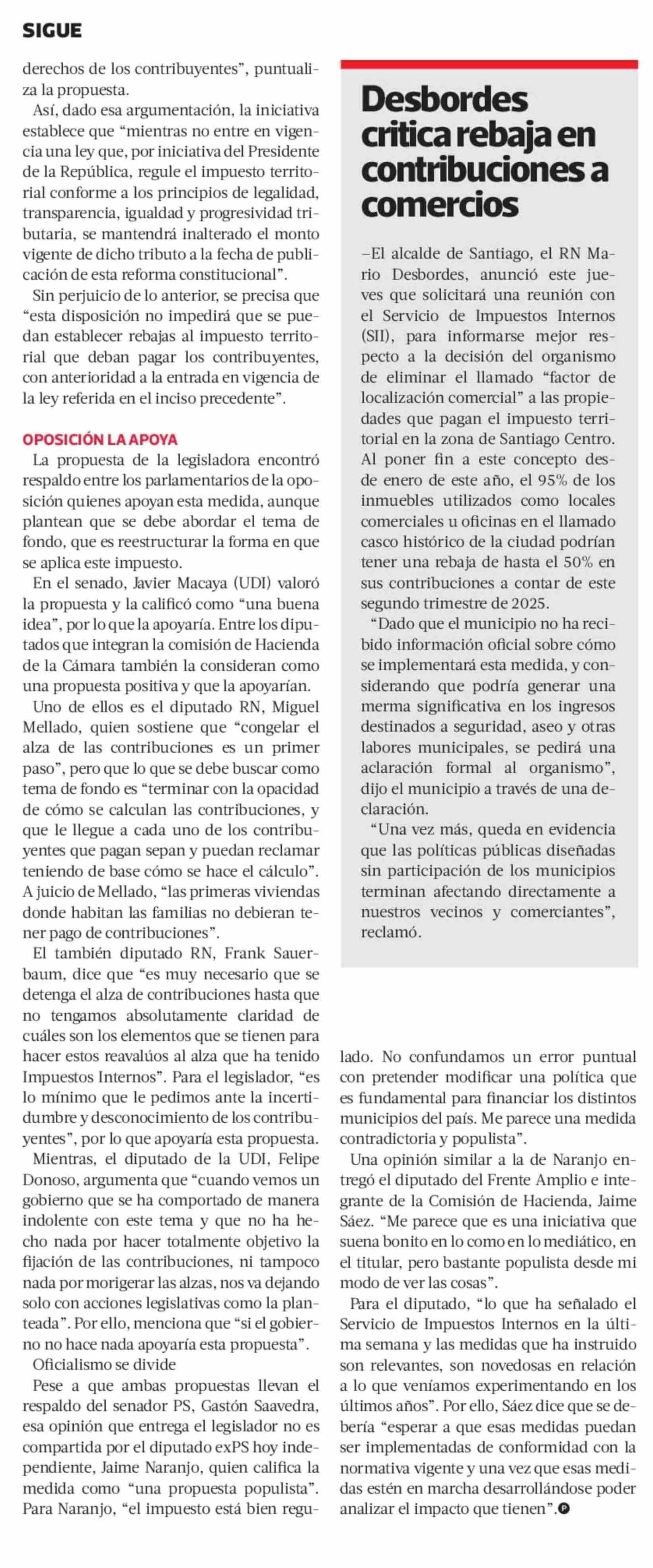 Oposición respalda proyecto de ley que busca “congelar” alza de las contribuciones y oficialismo se divide 20-06-2025 La Tercera |