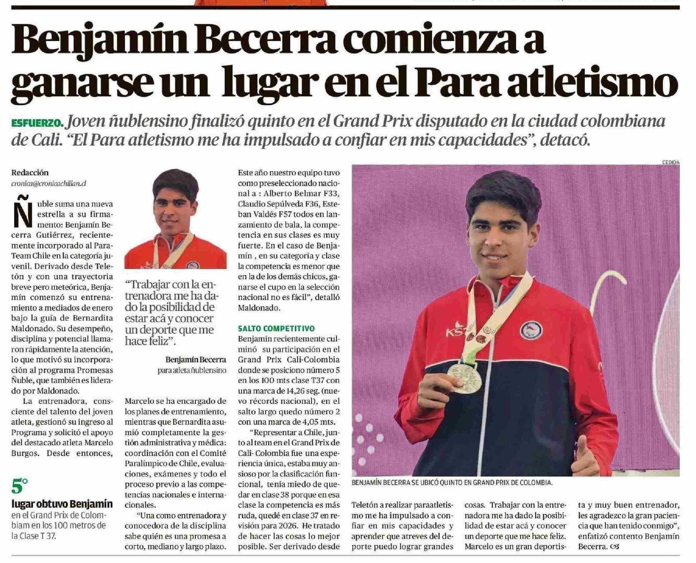 Benjamín Becerra comienza a ganarse un lugar en el Para atletismo 22-05-2025 Crónica de Chillán |