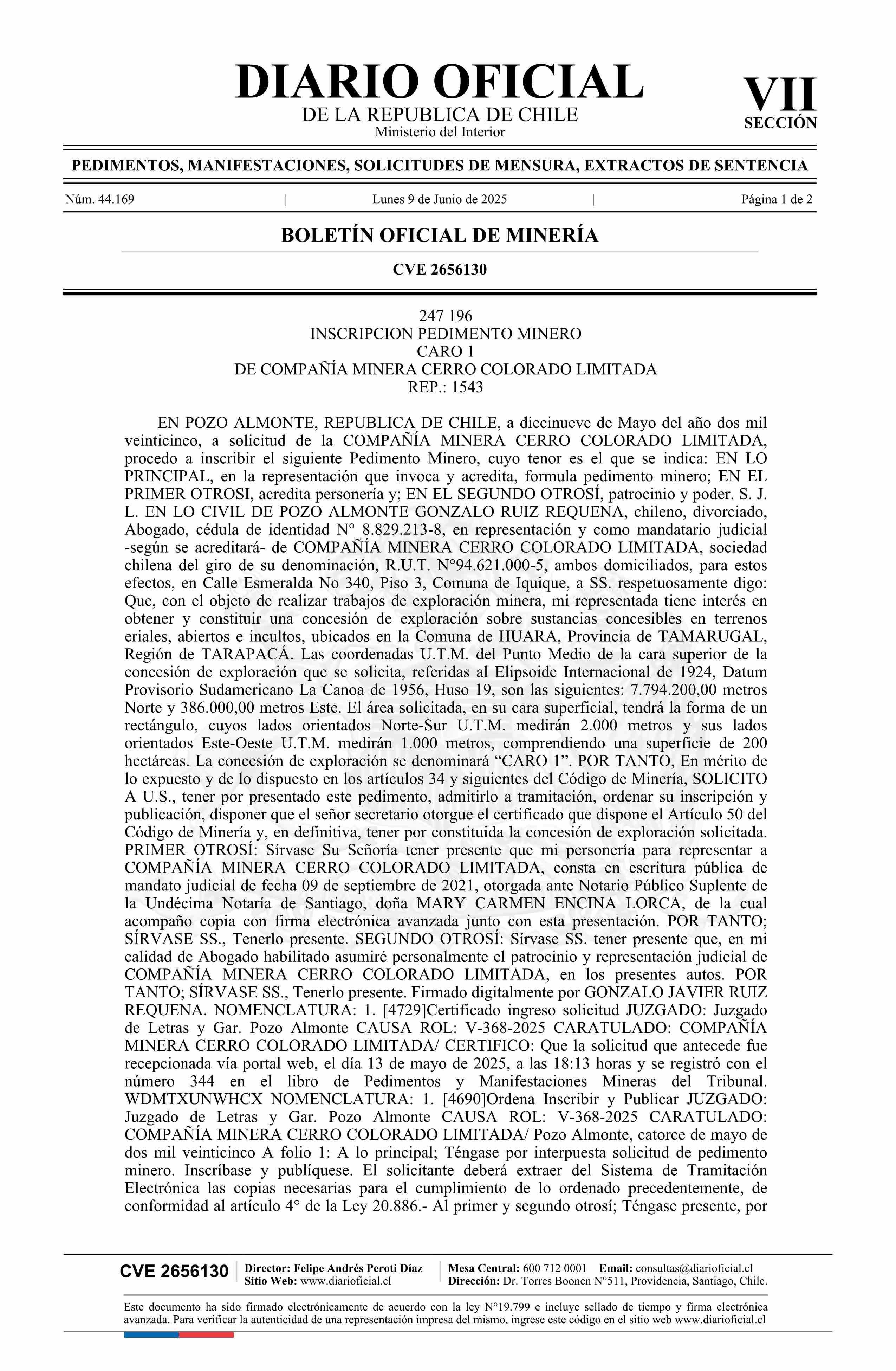 CARO 1 / Compañía Minera Cerro Colorado Limitada 09-06-2025 DIARIO OFICIAL CHILE - BOLETÍN OFICIAL DE MINERÍA |