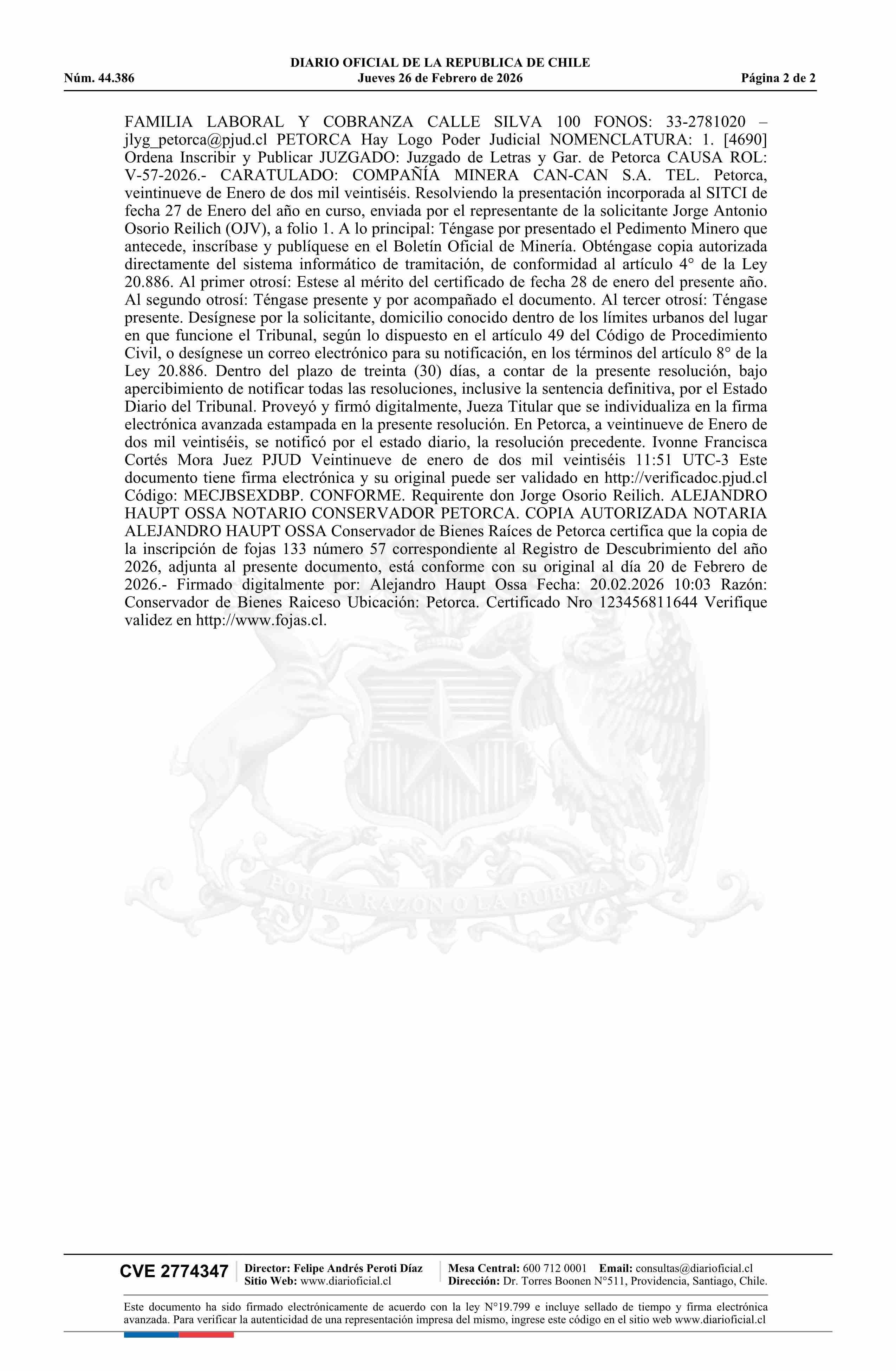IGNACIA 5 / Compañía Minera Can-Can S.A. 26-02-2026 DIARIO OFICIAL CHILE - BOLETÍN OFICIAL DE MINERÍA |
