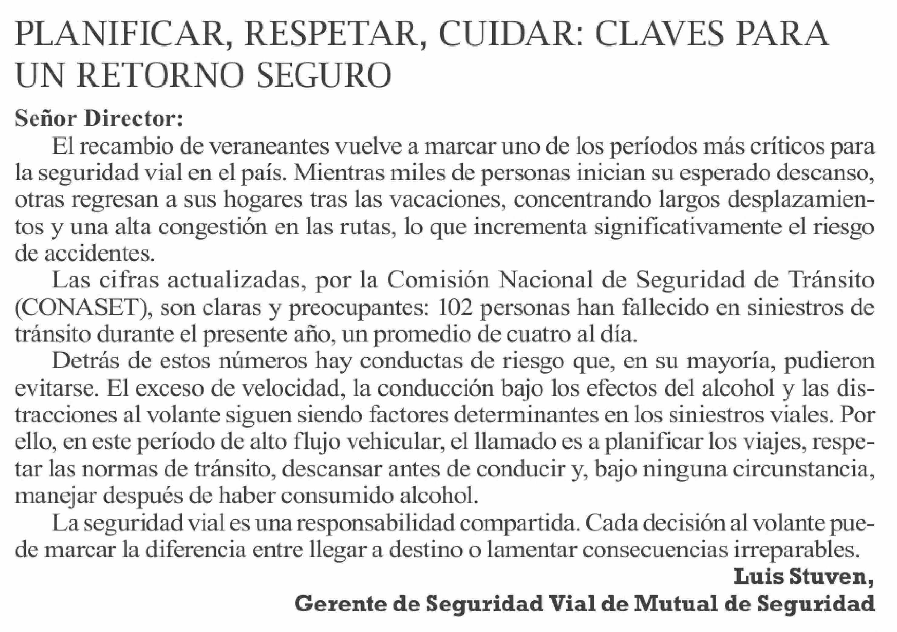 Cartas: PLANIFICAR, RESPETAR, CUIDAR: CLAVES PARA UN RETORNO SEGURO 02-02-2026 El Pingüino |