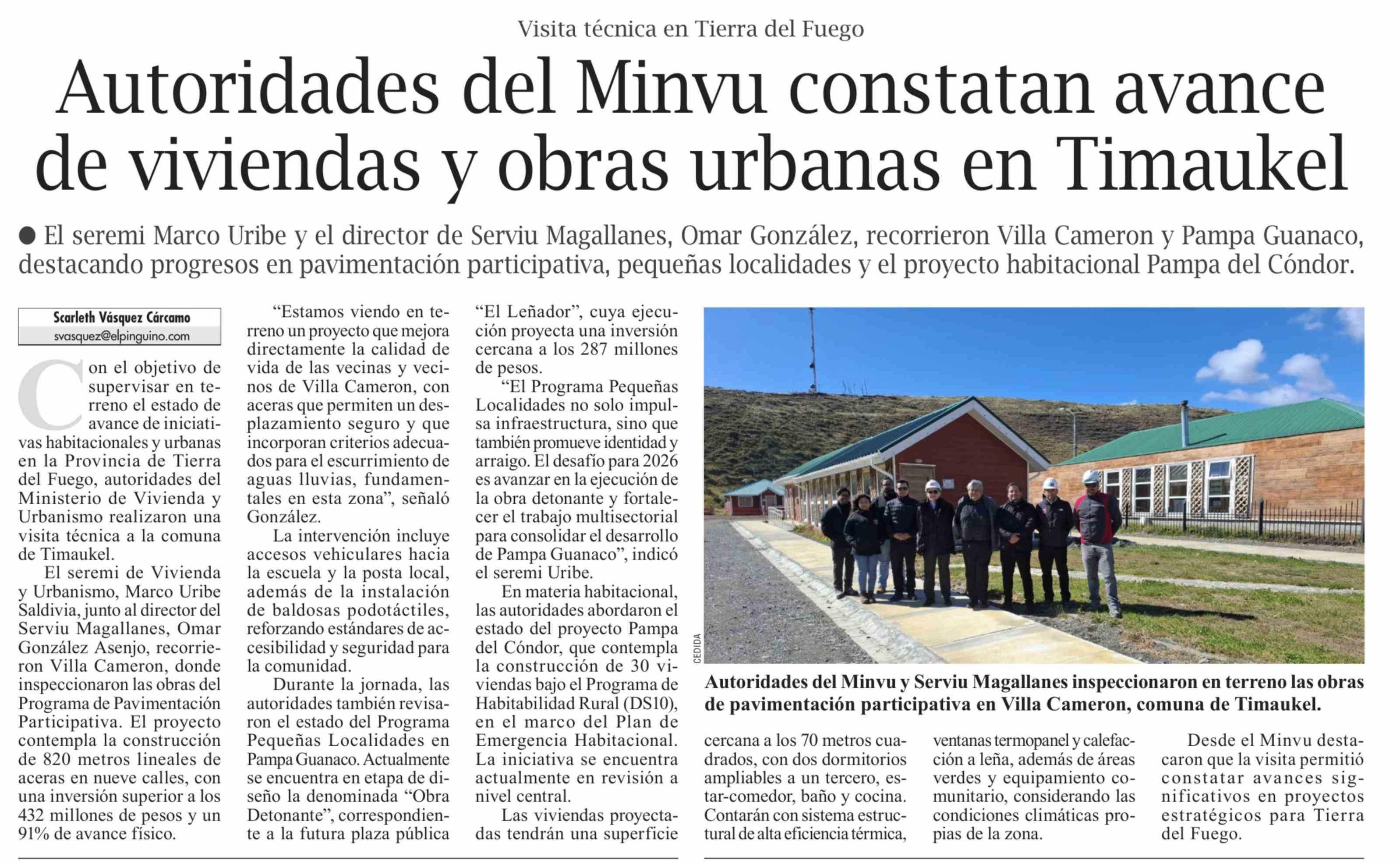 Título: Autoridades del Minvu constatan avance de viviendas y obras urbanas en Timaukel