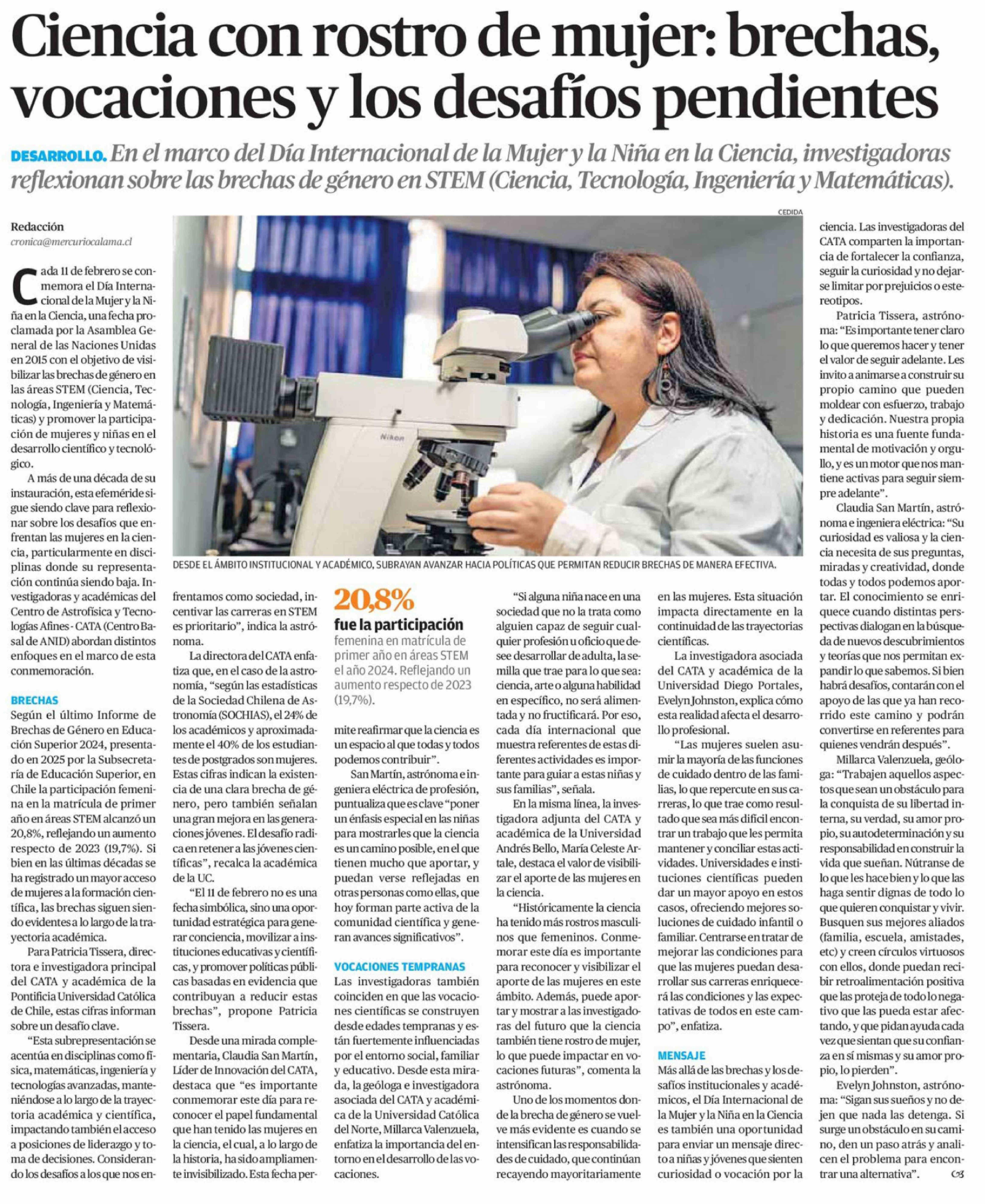 Ciencia con rostro de mujer: brechas, vocaciones y los desafíos pendientes 11-02-2026 El Mercurio de Calama |