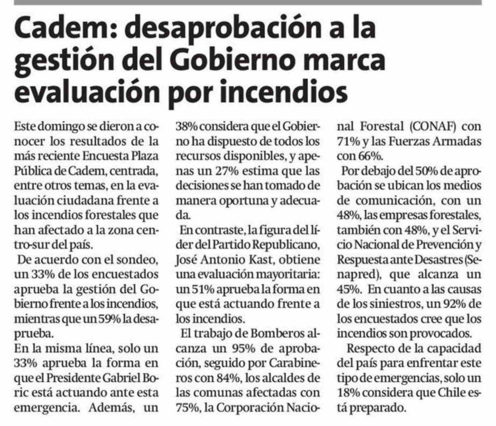 | Título: | Cadem: desaprobación a la gestión del Gobierno marca evaluación por incendios |
