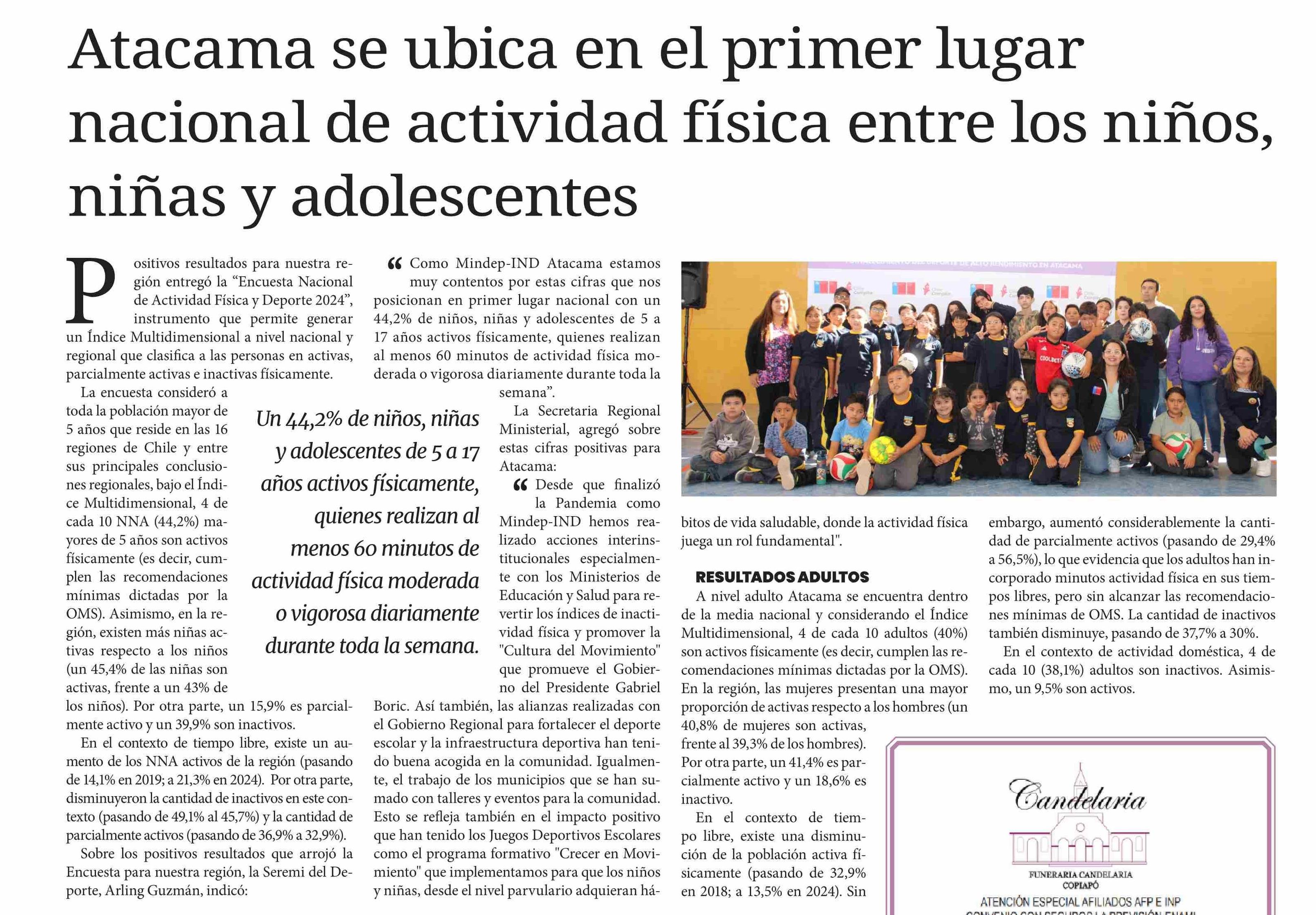 Atacama se ubica en el primer lugar nacional de actividad física entre los niños, niñas y adolescentes 25-05-2025 Diario Chañarcillo |
