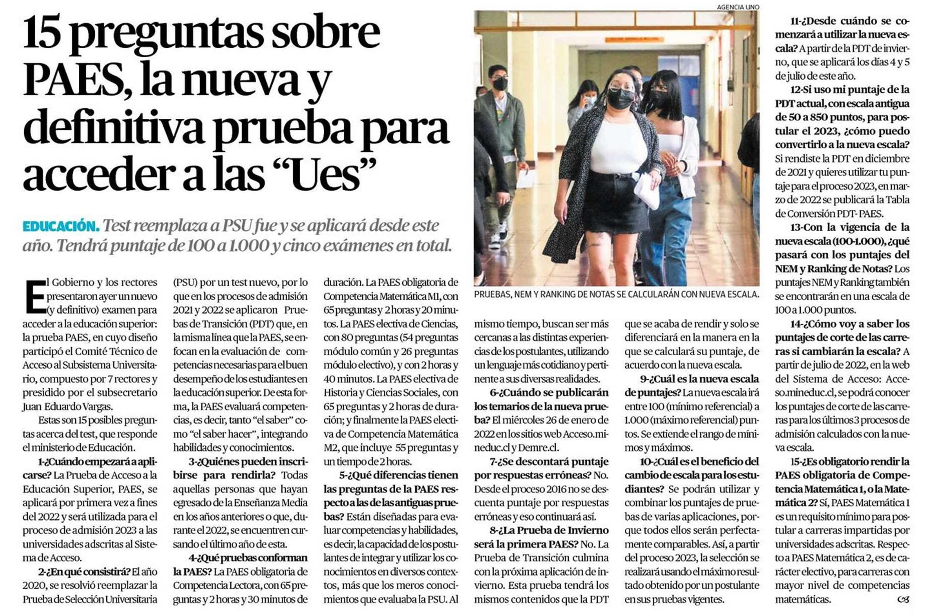 15 preguntas sobre PAES, la nueva y definitiva prueba para acceder a las “Ues” 19-01-2022 El Mercurio de Antofagasta |