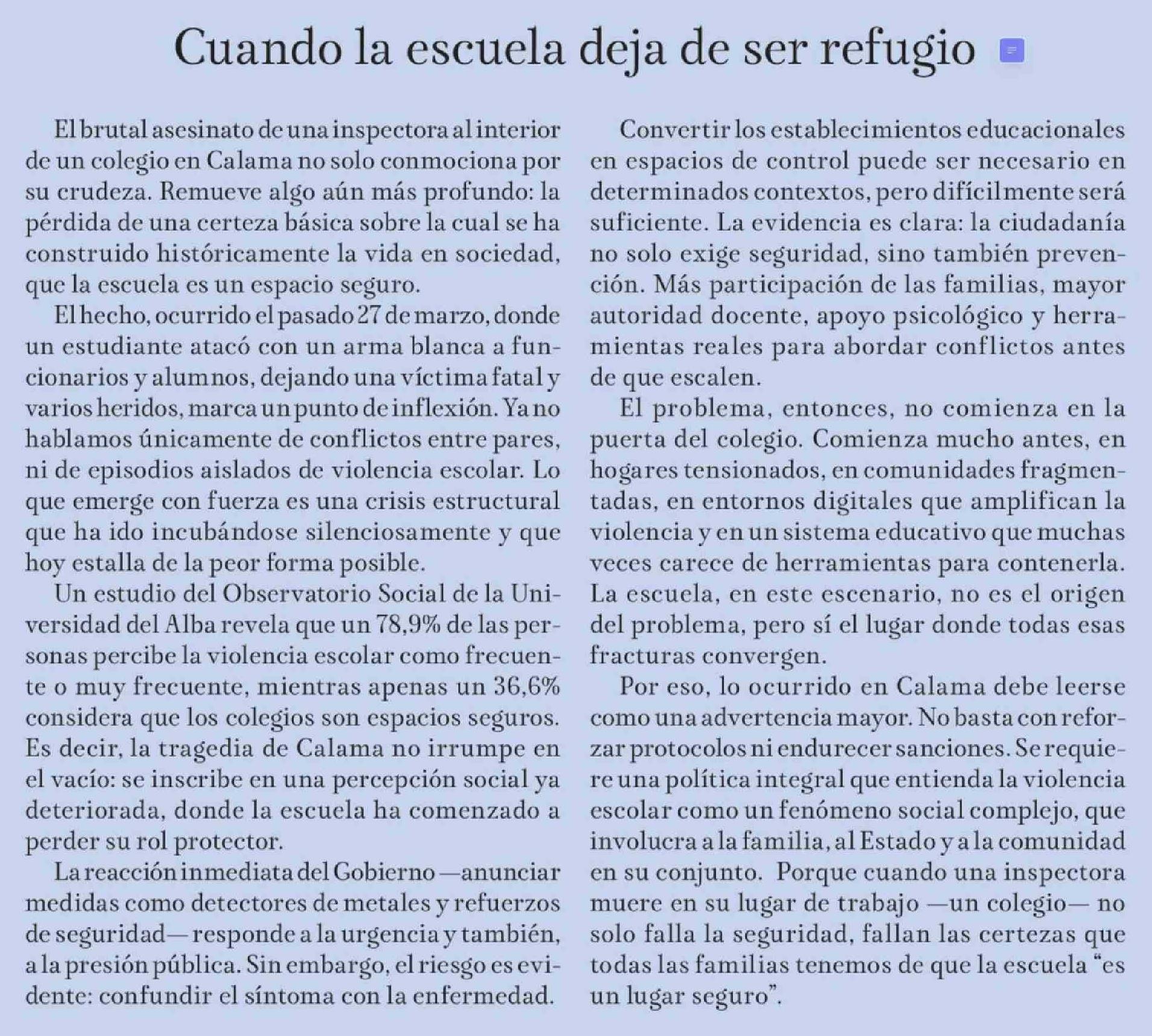 Editorial: Cuando la escuela deja de ser refugio 31-03-2026 La Tribuna |