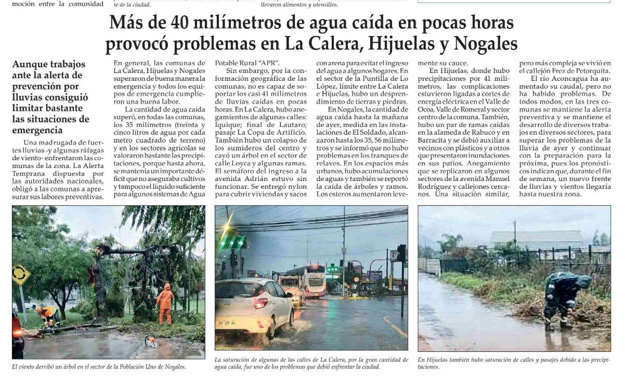 | Título: | Más de 40 milímetros de agua caída en pocas horas provocó problemas en La Calera, Hijuelas y Nogales |