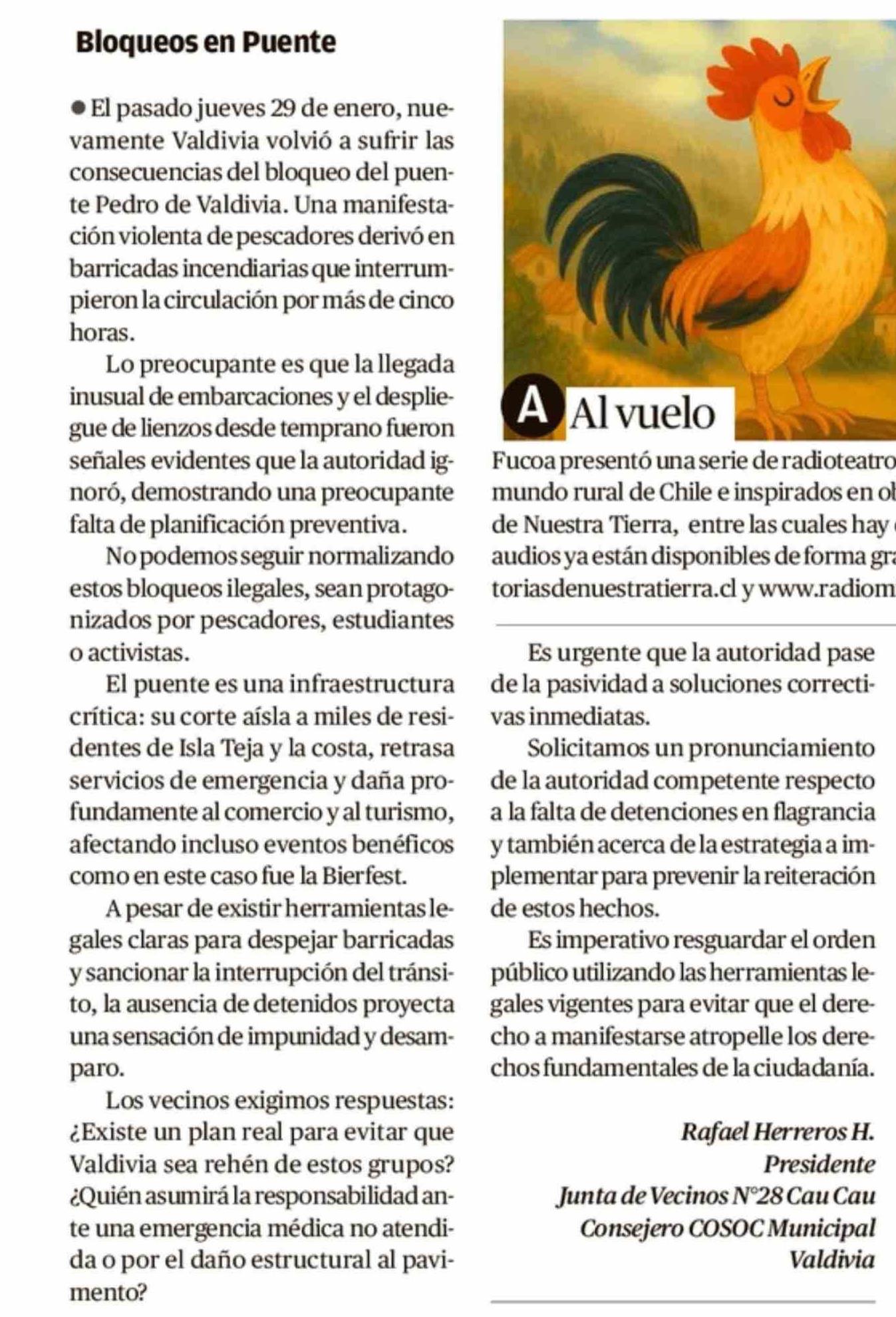 CARTAS: Bloqueos en Puente 13-02-2026 Diario Austral Región de Los Ríos |