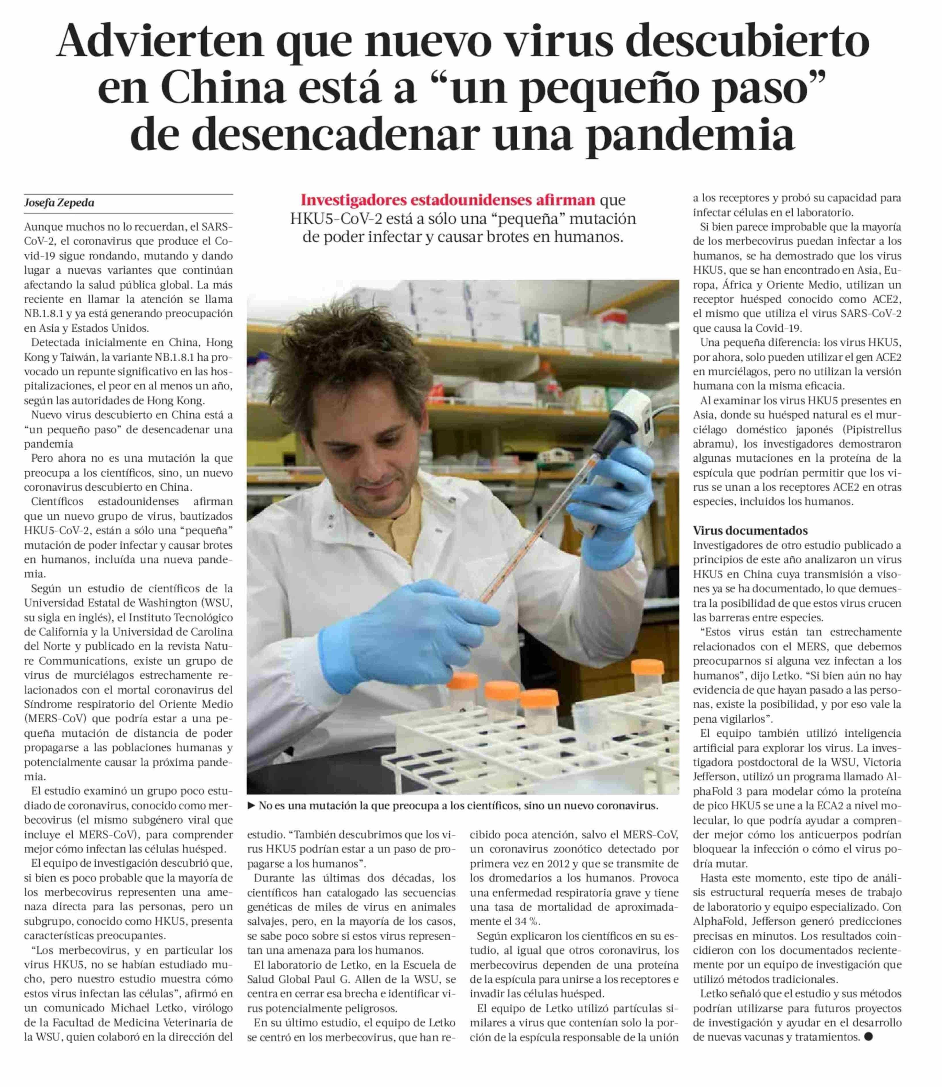 Advierten que nuevo virus descubierto en China está a “un pequeño paso” de desencadenar una pandemia 09-06-2025 La Tercera |
