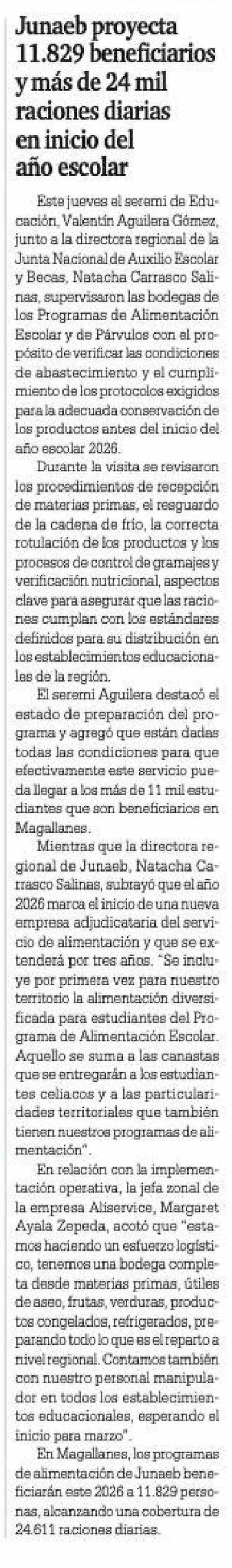 Junaeb proyecta 11.829 beneficiarios y más de 24 mil raciones diarias en inicio del año escolar 27-02-2026 La Prensa Austral |
