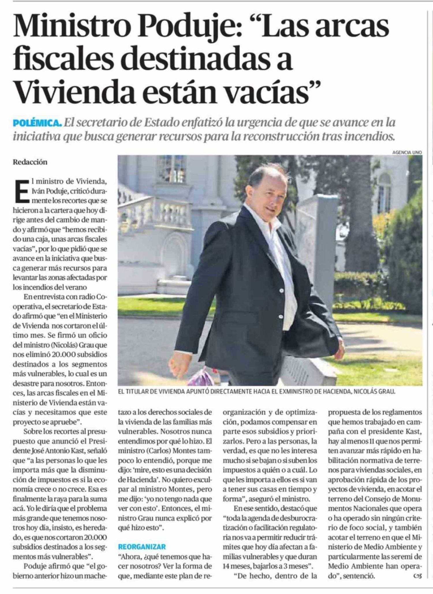 Ministro Poduje: "Las arcas fiscales destinadas a Vivienda están vacías" 17-03-2026 El Mercurio de Calama |