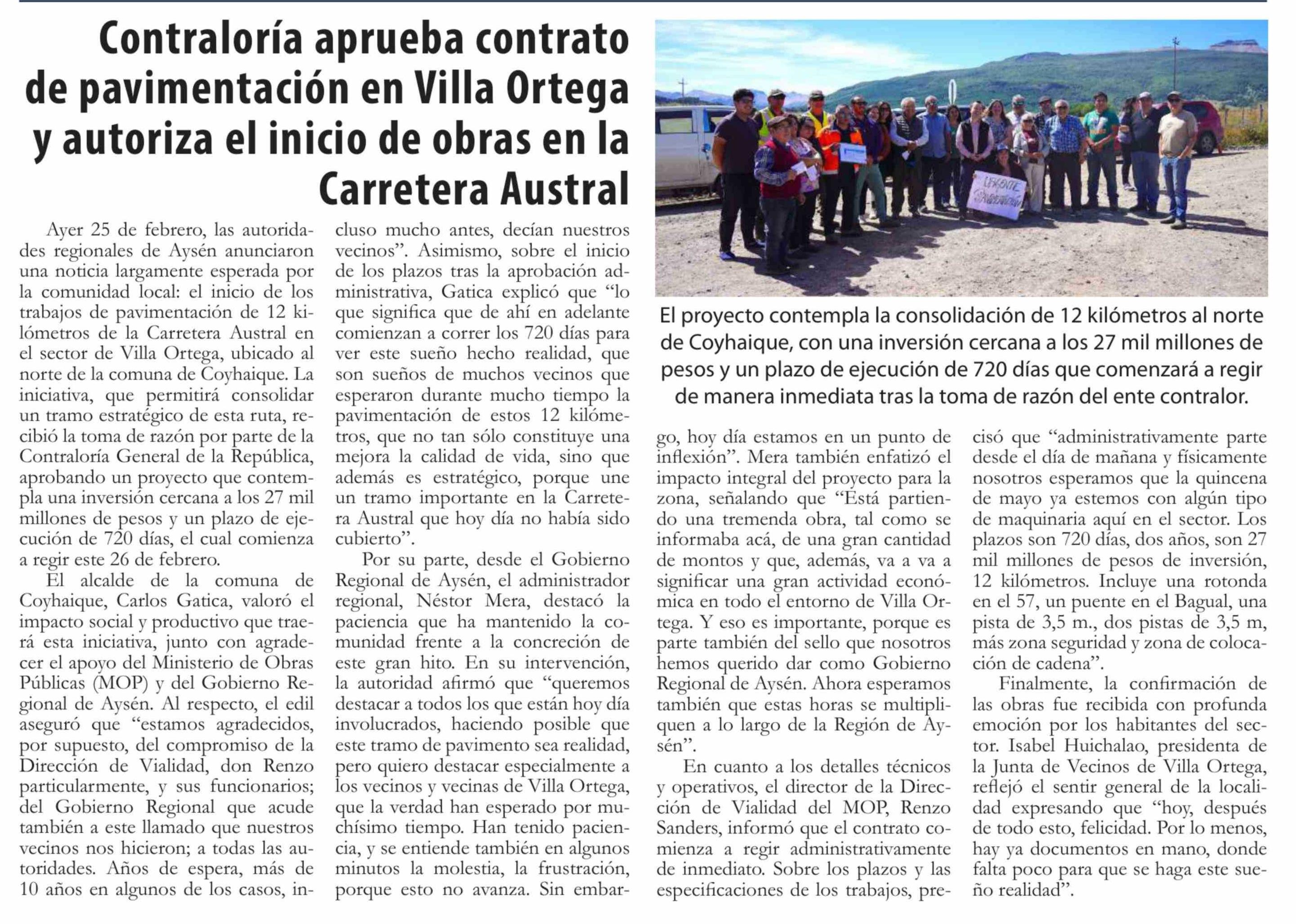 | Título: | Contraloría aprueba contrato de pavimentación en Villa Ortega y autoriza el inicio de obras en la Carretera Austral |