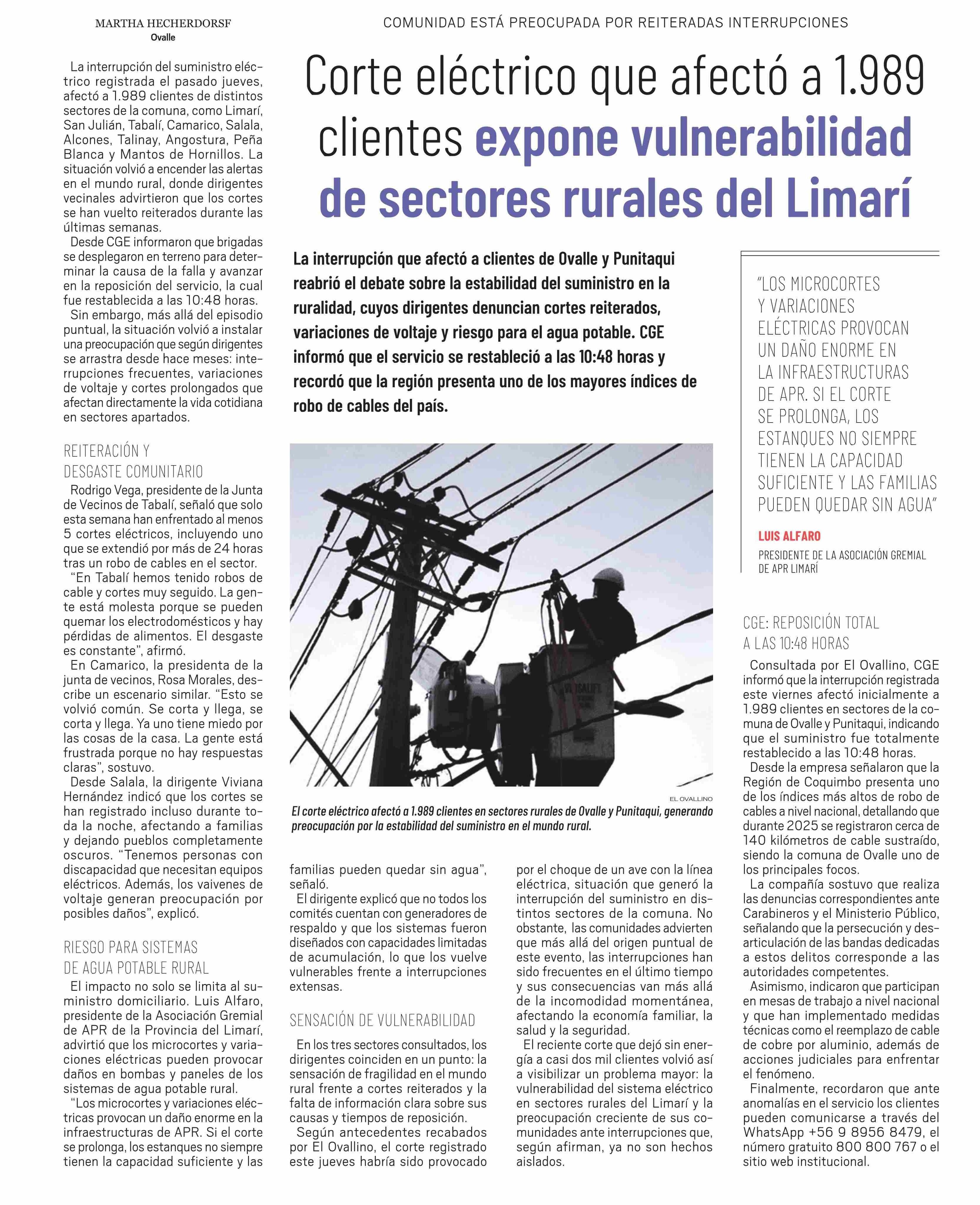 Corte eléctrico que afectó a 1.989 clientes expone vulnerabilidad de sectores rurales del Limarí 14-02-2026 El Ovallino |