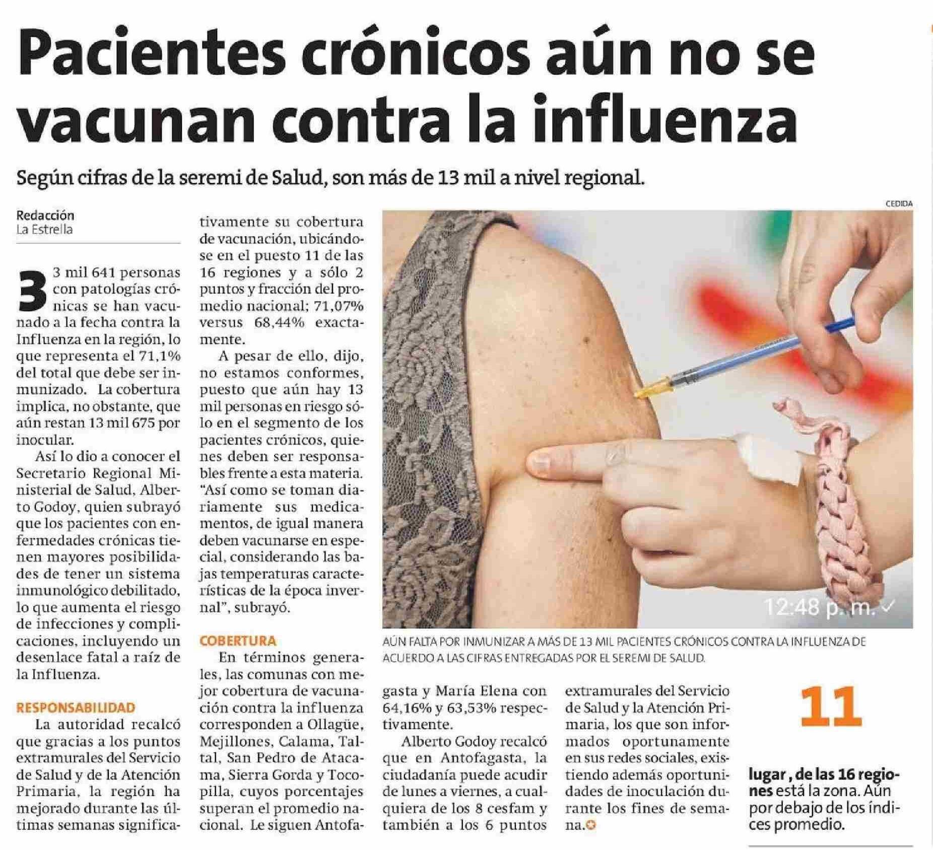 Pacientes crónicos aún no se vacunan contra la influenza 30-05-2025 La Estrella de Antofagasta |