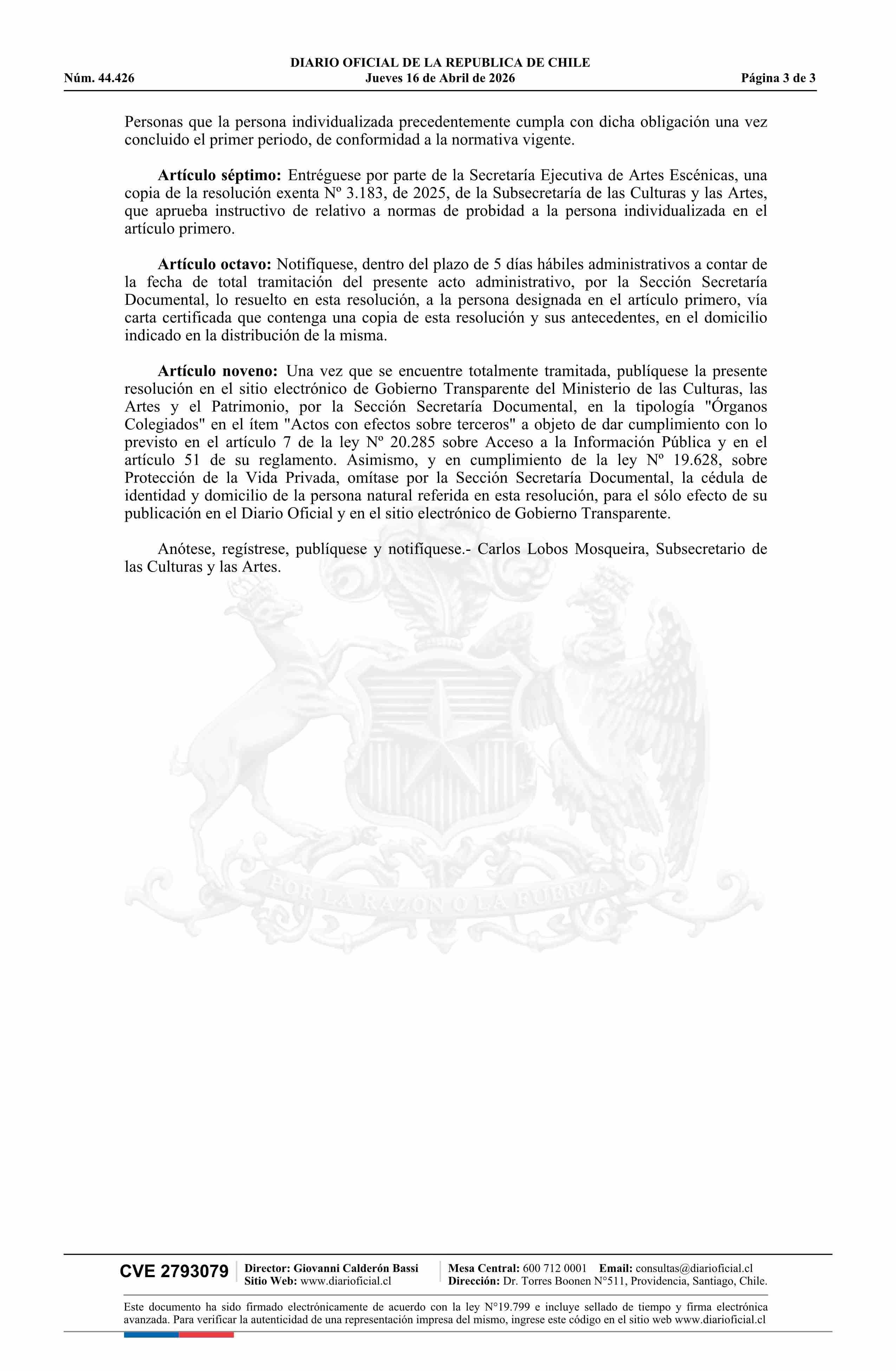 | Título: | Resolución exenta número 911, de 2026.- Formaliza designación de don Guillermo Carlos de Jesús Ganga Martínez como integrante del Consejo Nacional de las Artes Escénicas |