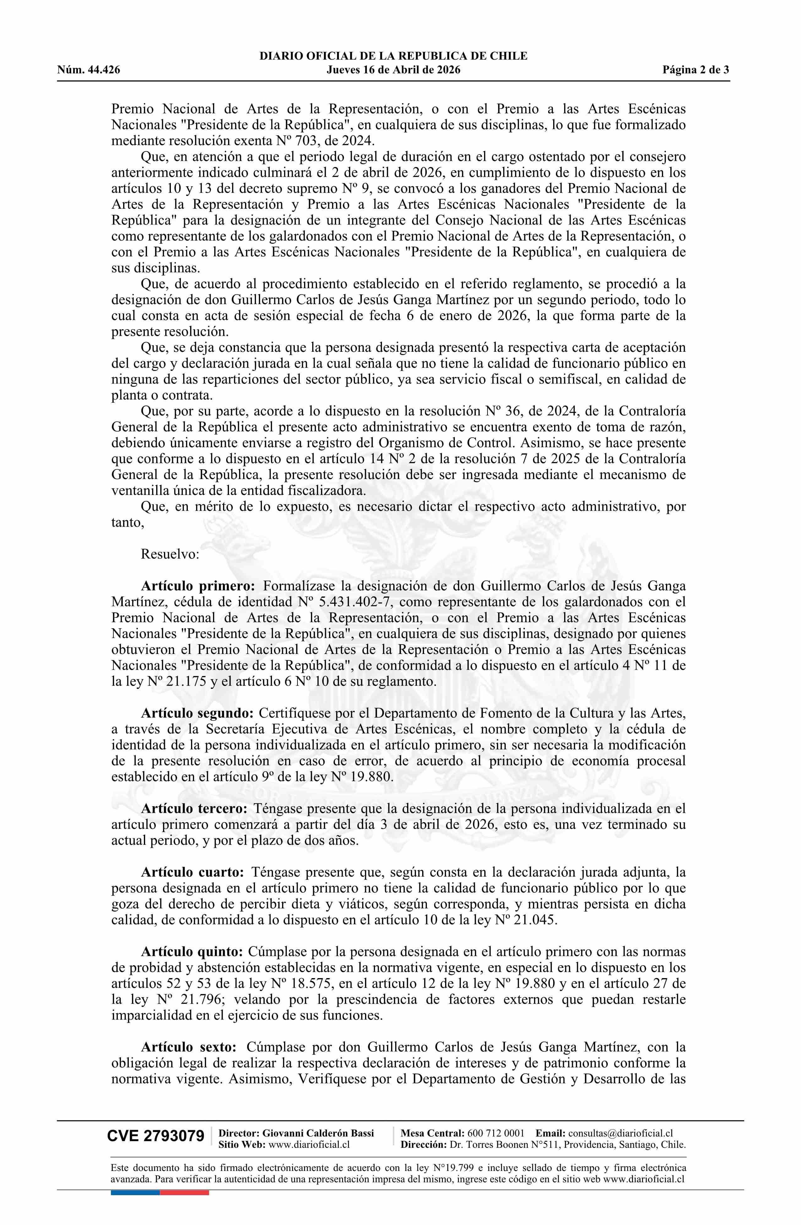 Resolución exenta número 911, de 2026.- Formaliza designación de don Guillermo Carlos de Jesús Ganga Martínez como integrante del Consejo Nacional de las Artes Escénicas 16-04-2026 Diario Oficial Edición Electrónica |