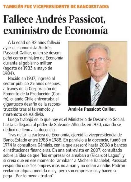 Fallece Andrés Passicot, exministro de Economía 29-06-2020 El Mercurio |