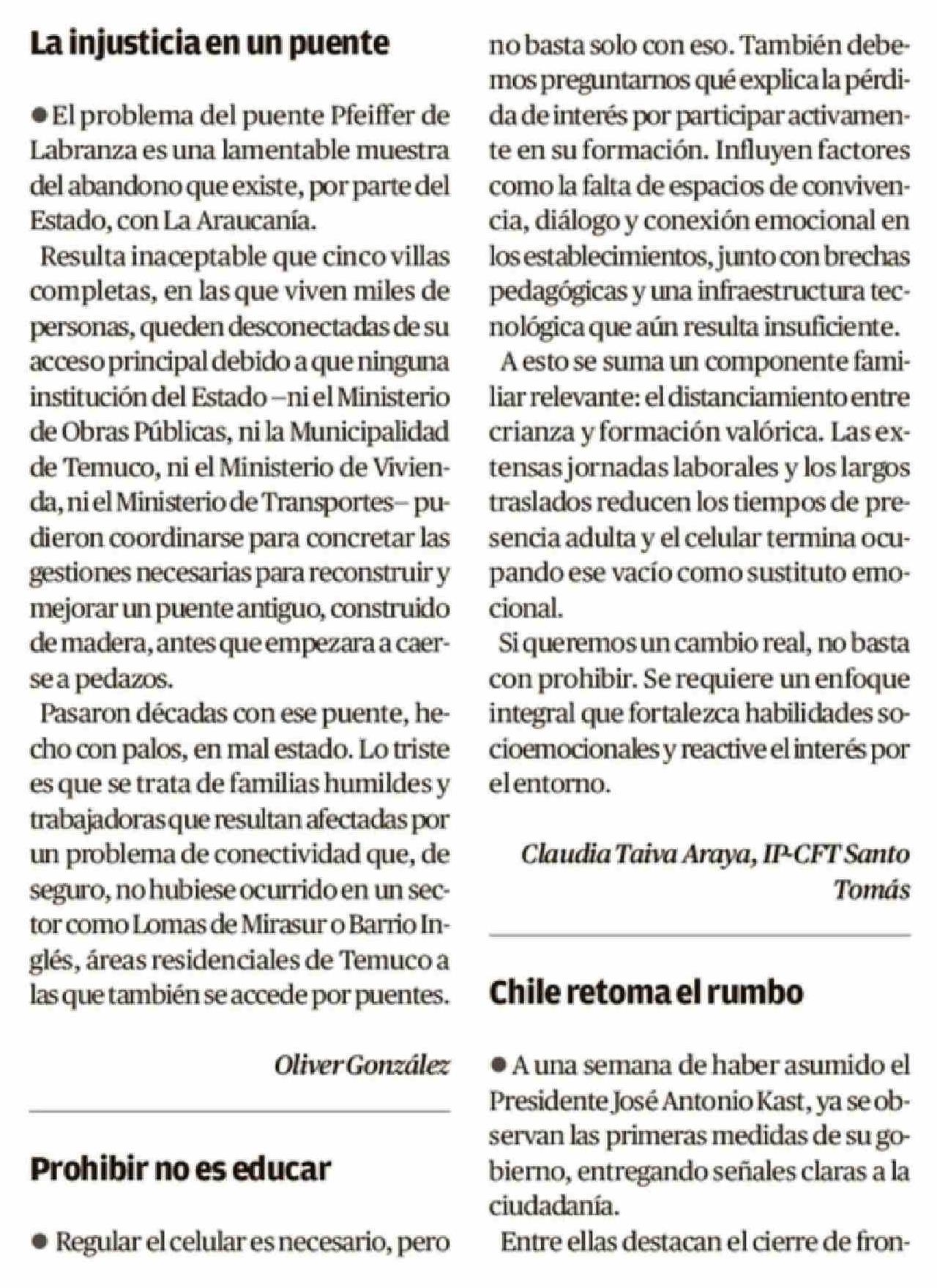 Cartas: Prohibir no es educar 19-03-2026 El Austral de la Araucanía |