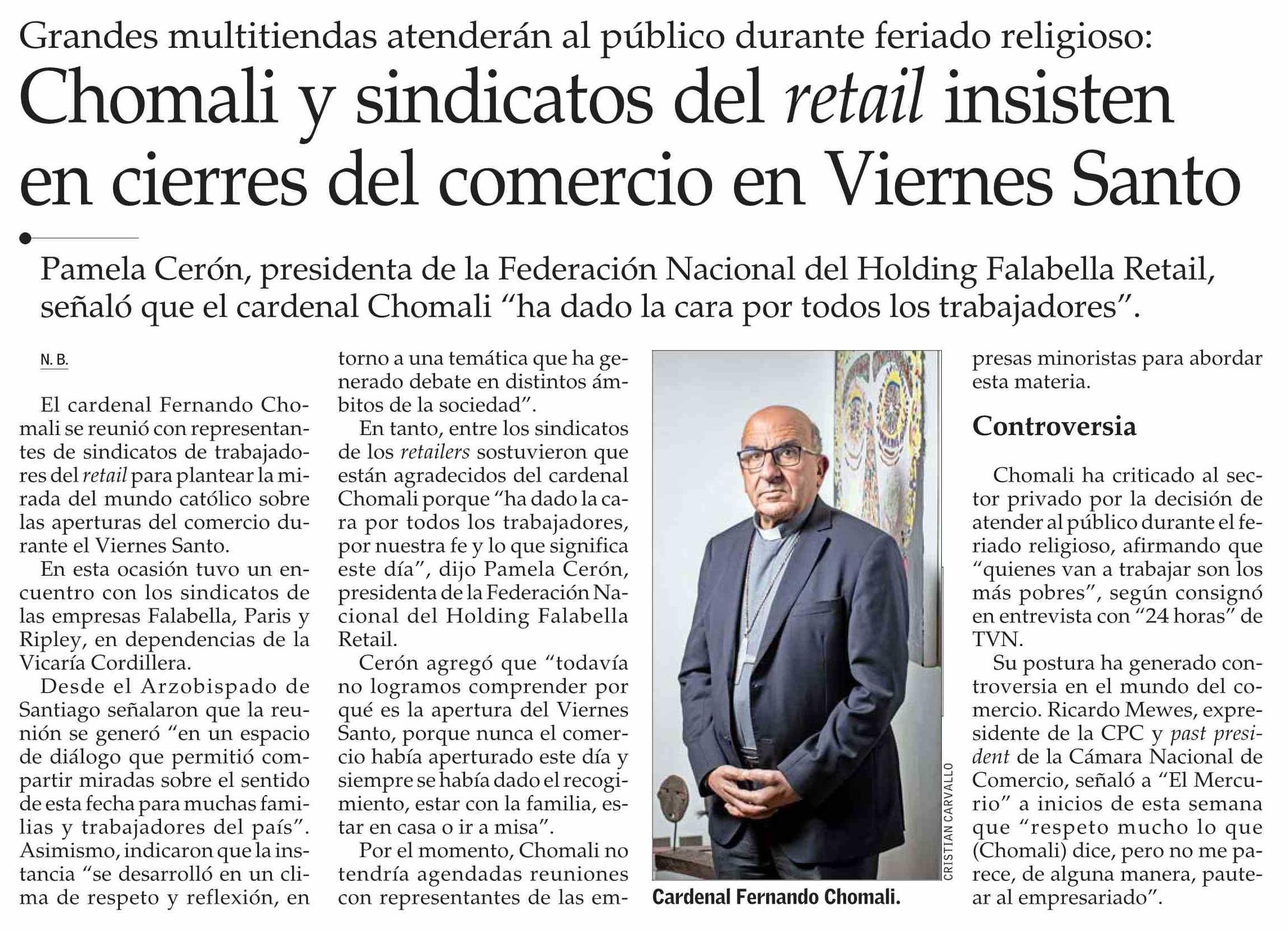 Chomali y sindicatos del retail insisten en cierres del comercio en Viernes Santo 26-03-2026 El Mercurio |