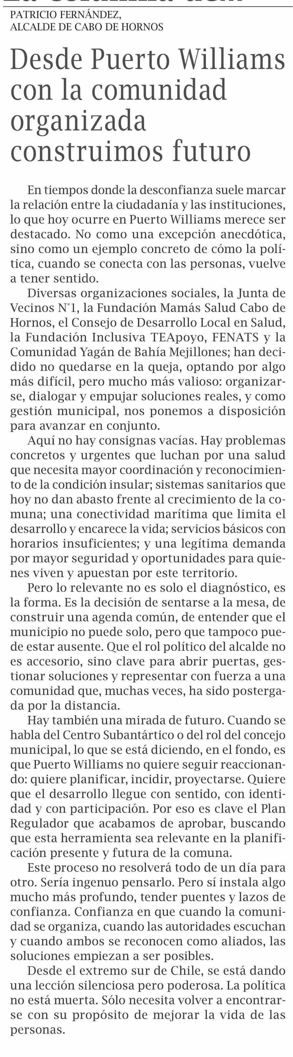| Título: | Columnas de Opinión: Desde Puerto Williams con la comunidad organizada construimos futuro |