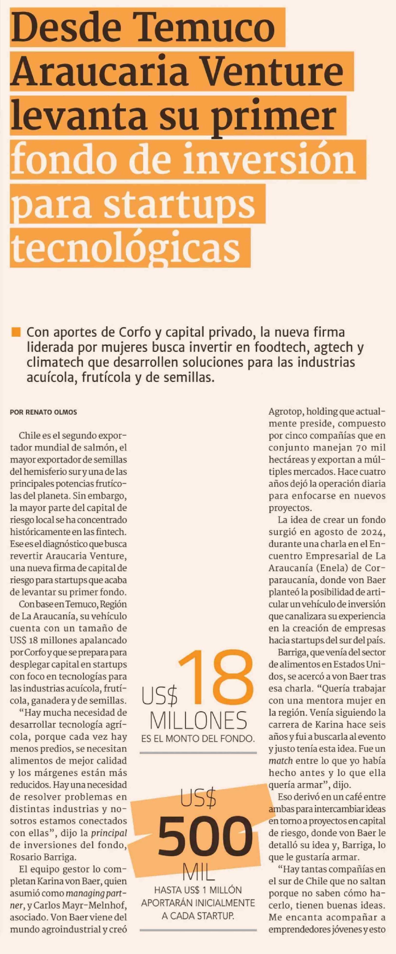 Desde Temuco Araucaria Venture levanta su primer fondo de inversión para startups tecnológicas 06-04-2026 Diario Financiero |