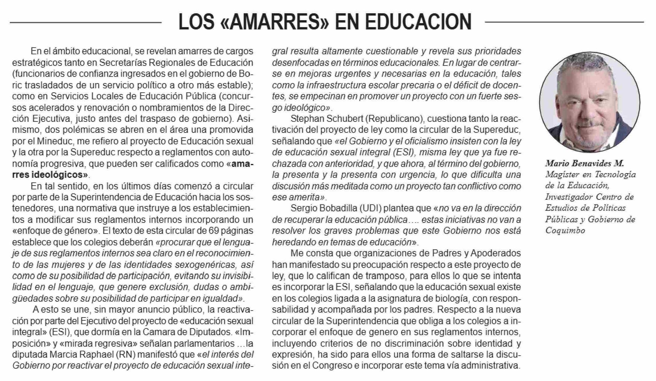 Columnas de Opinión: LOS «AMARRES» EN EDUCACION 17-01-2026 Diario la Región |