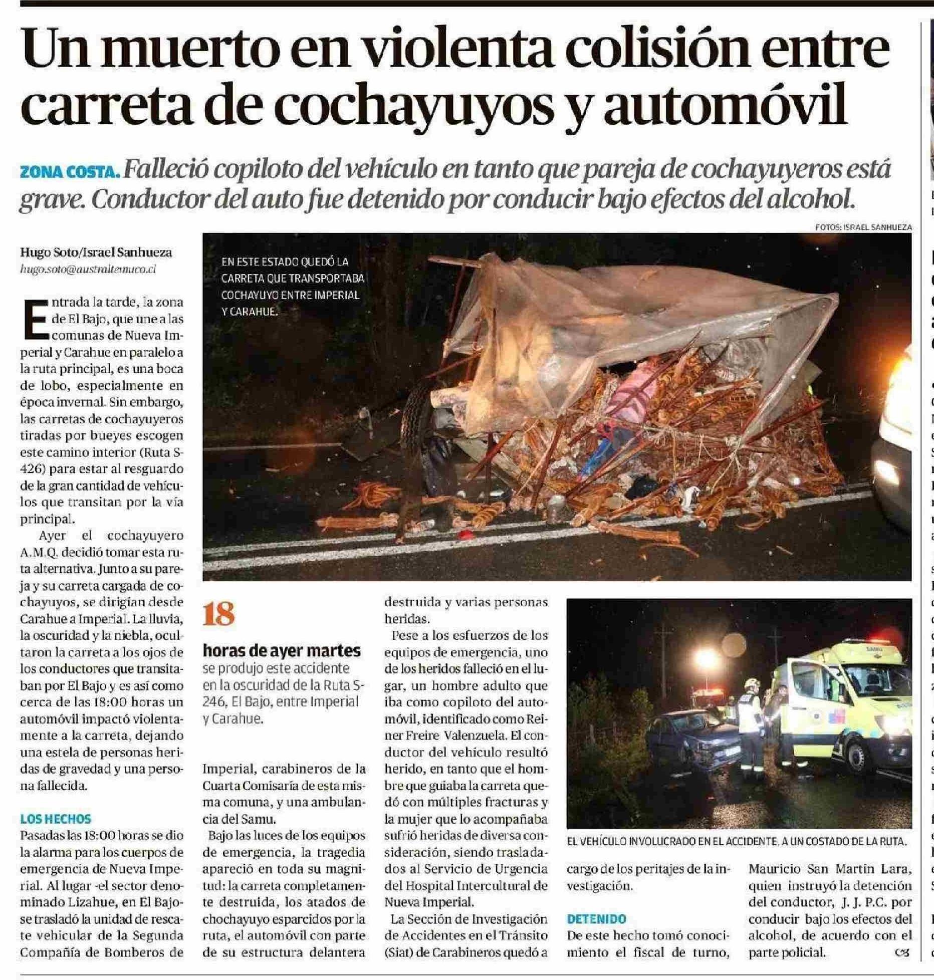 Un muerto en violenta colisión entre carreta de cochayuyos y automóvil 05-06-2025 El Austral de la Araucanía |