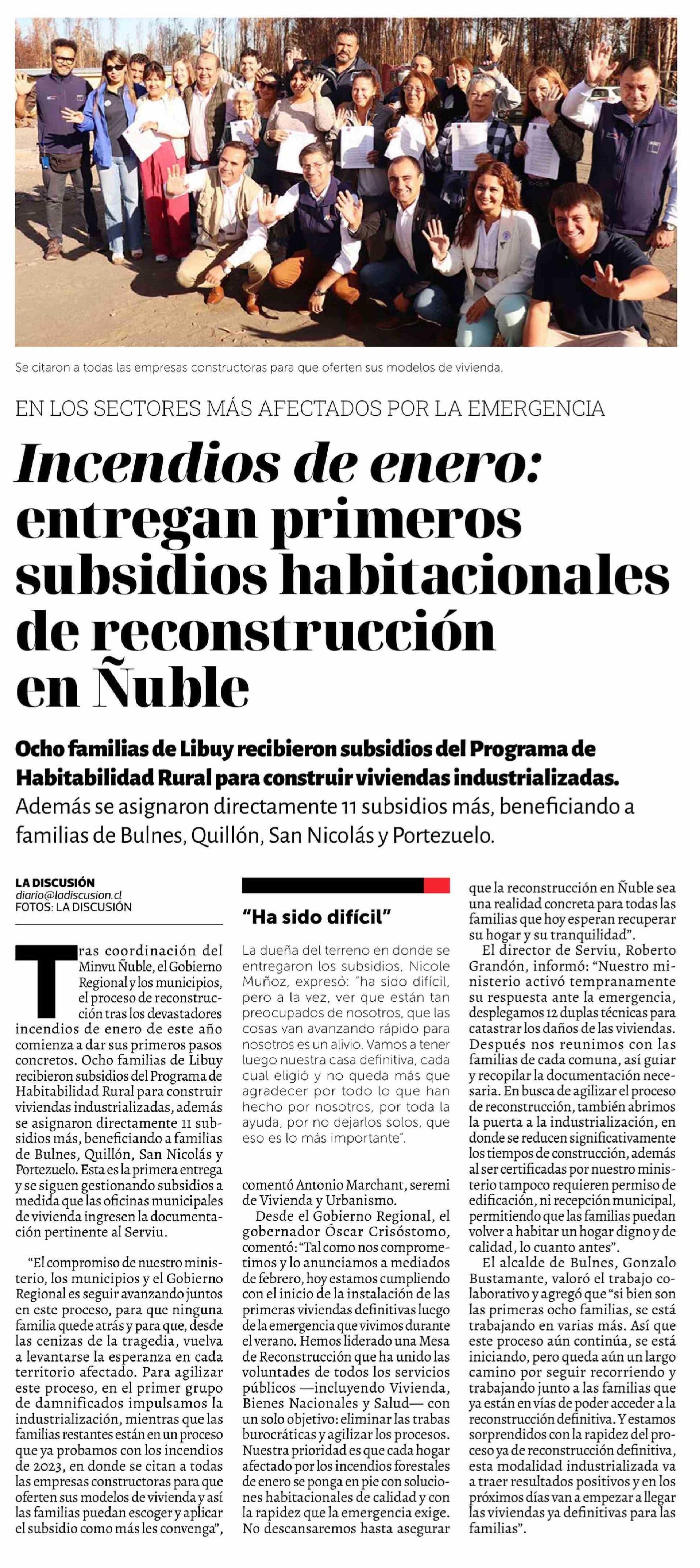 Incendios de enero: entregan primeros subsidios habitacionales de reconstrucción en Ñuble 09-03-2026 La Discusión |