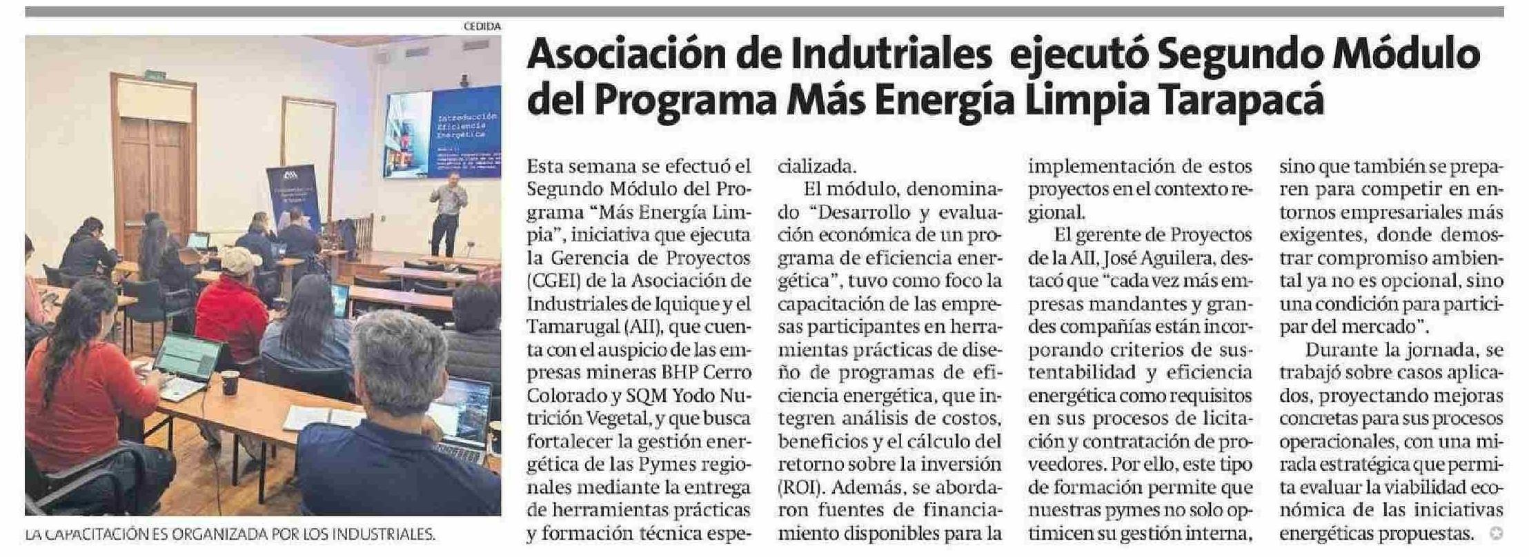 Asociación de Indutriales ejecutó Segundo Módulo del Programa Más Energía Limpia Tarapacá 09-05-2025 La Estrella de Iquique |