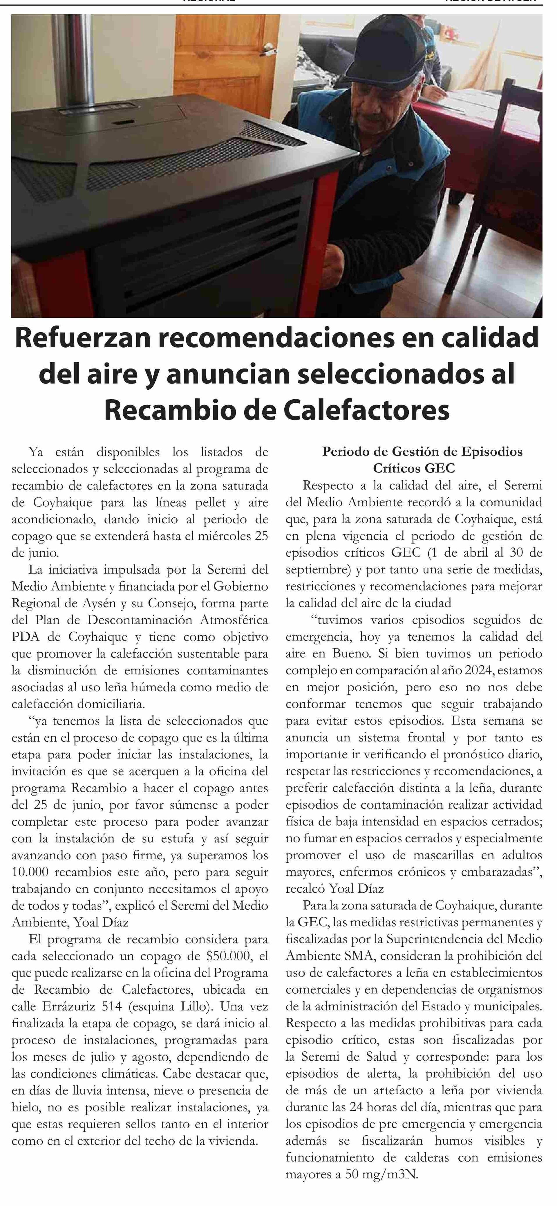 Refuerzan recomendaciones en calidad del aire y anuncian seleccionados al Recambio de Calefactores 17-06-2025 El Divisadero |