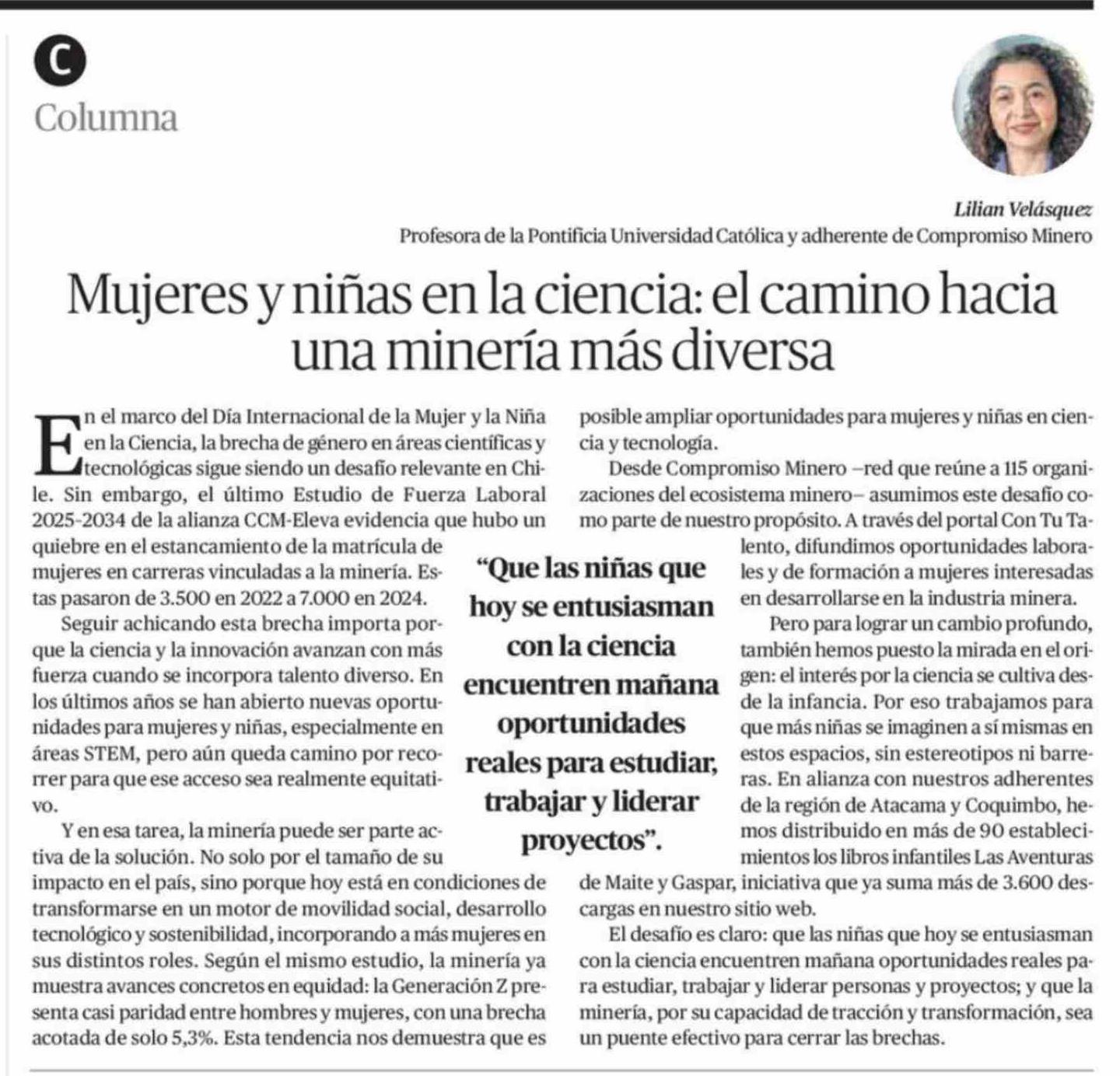 Columnas de Opinión: Mujeres y niñas en la ciencia: el camino hacia una minería más diversa 14-02-2026 El Mercurio de Calama |