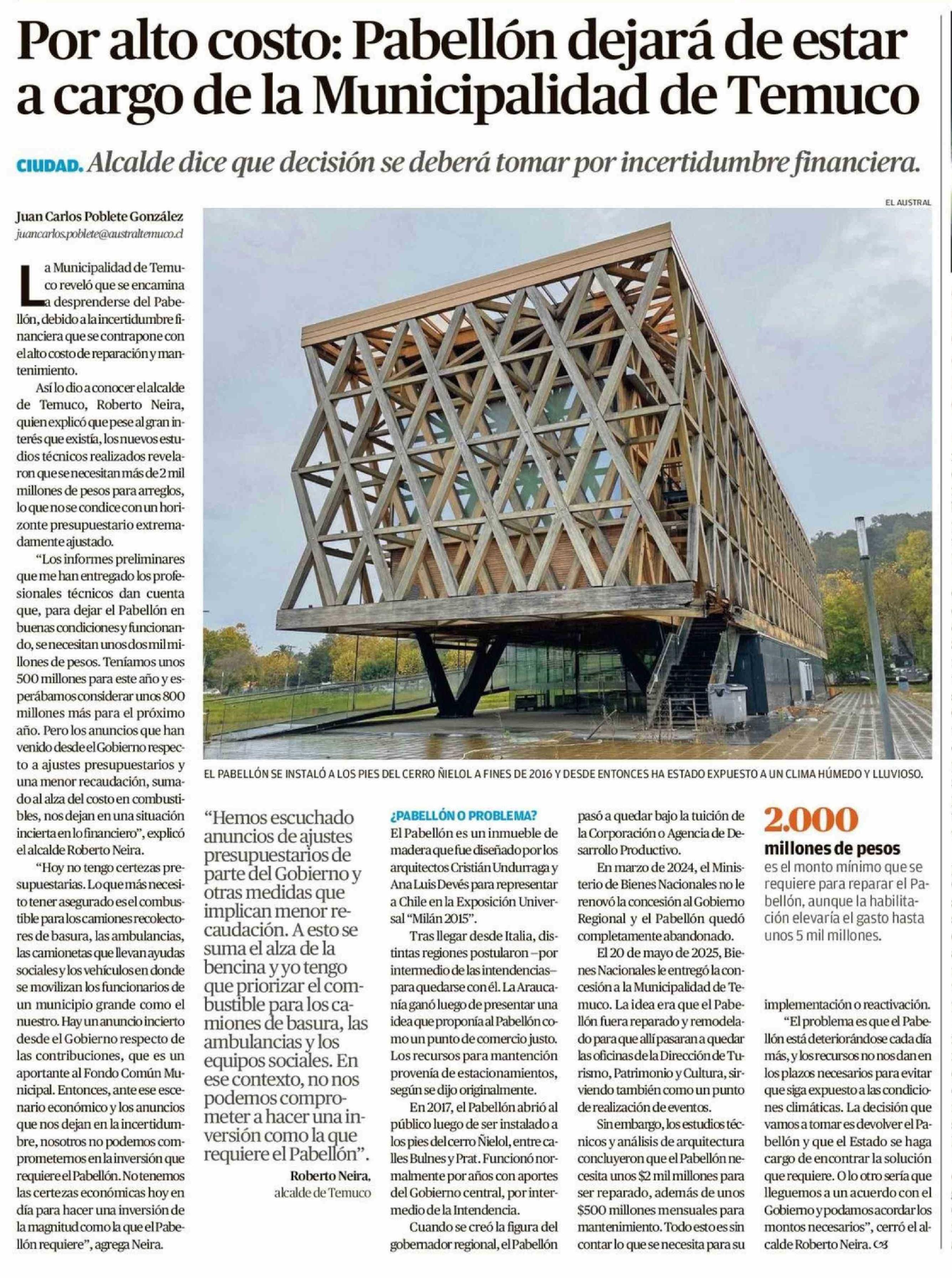 | Título: | Por alto costo: Pabellón dejará de estar a cargo de la Municipalidad de Temuco |