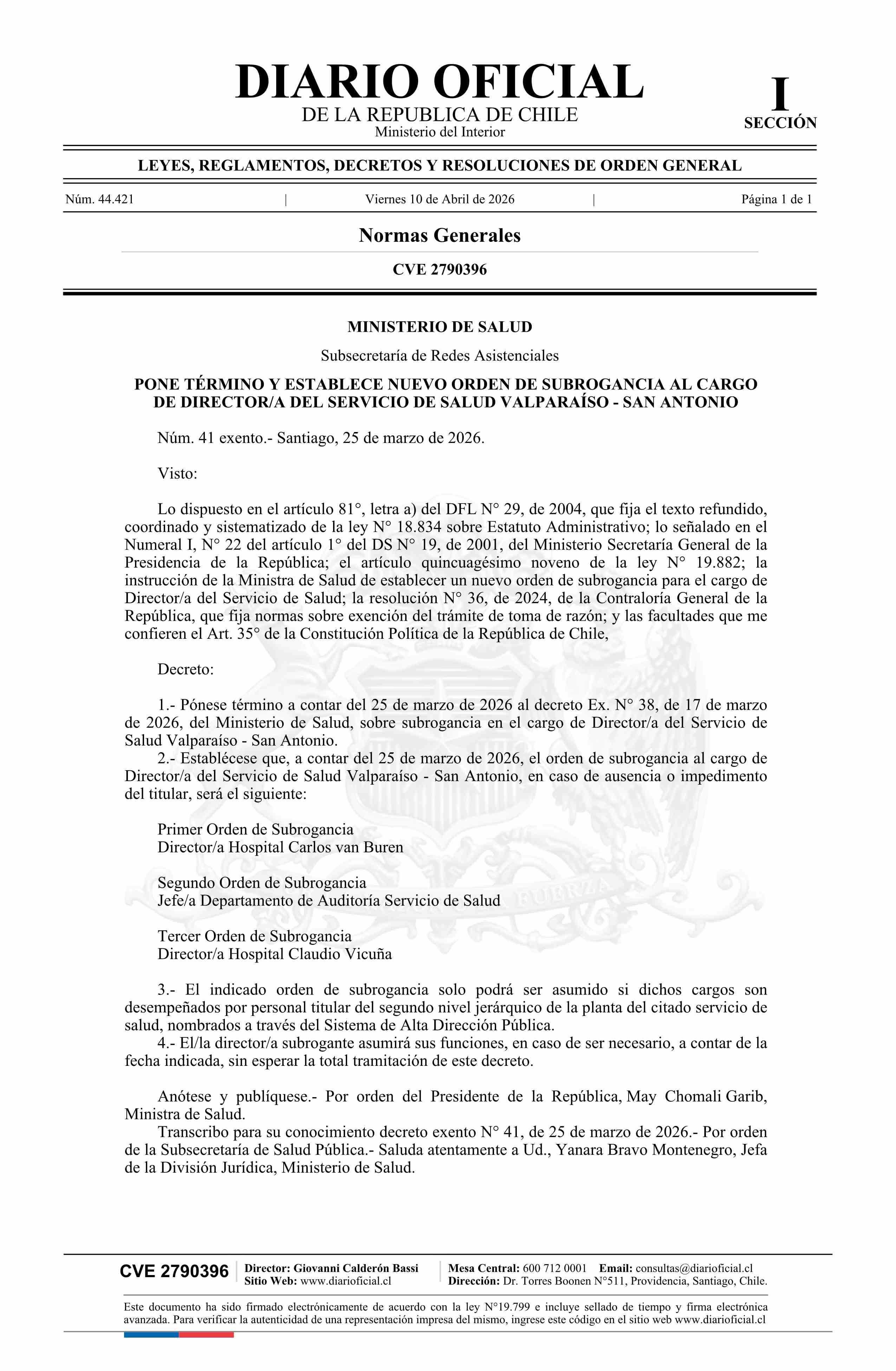 Título: Decreto exento número 41, de 2026.- Pone término y establece nuevo orden de subrogancia al cargo de Director/a del Servicio de Salud Valparaíso - San Antonio