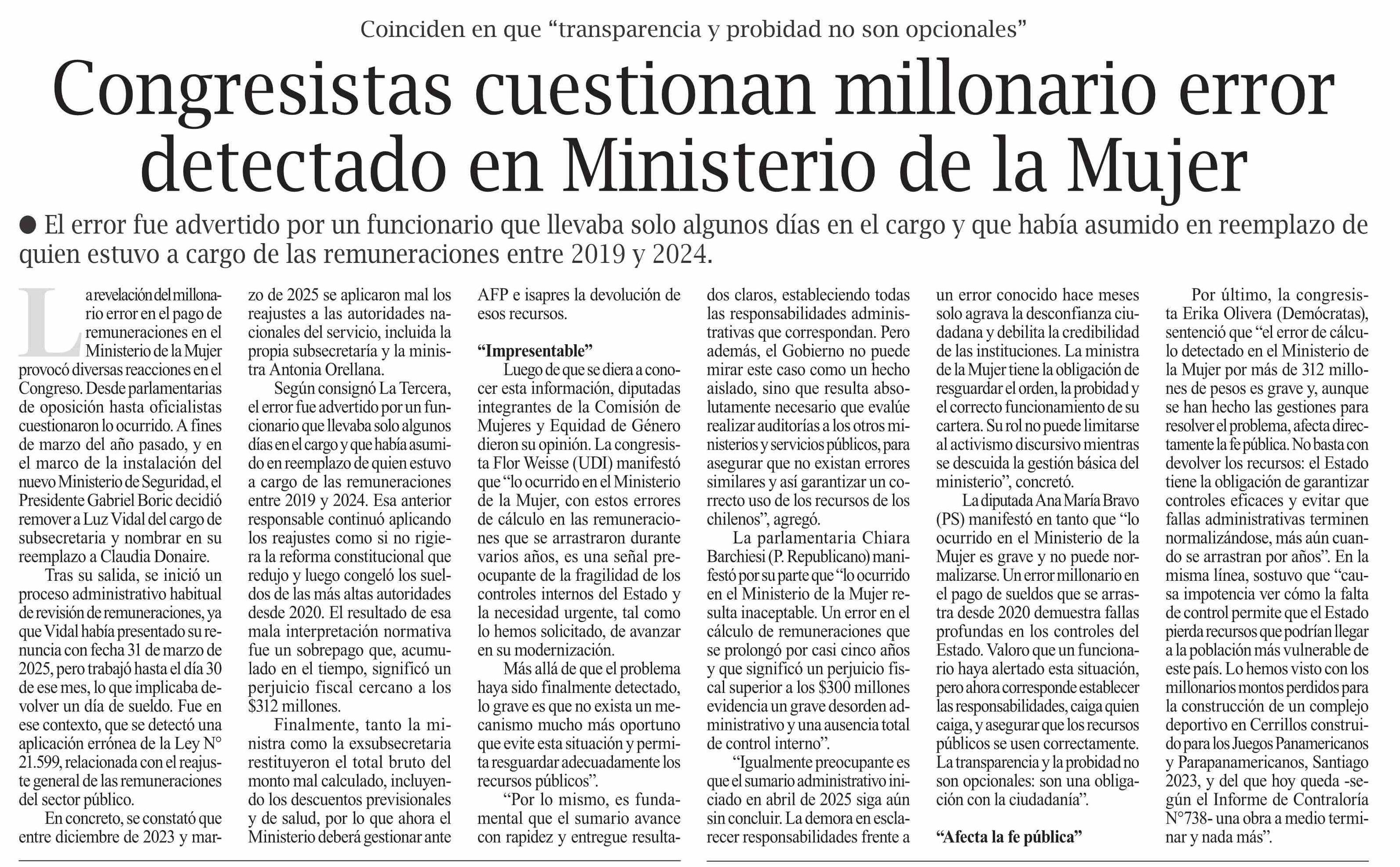 | Título: | Congresistas cuestionan millonario error detectado en Ministerio de la Mujer |