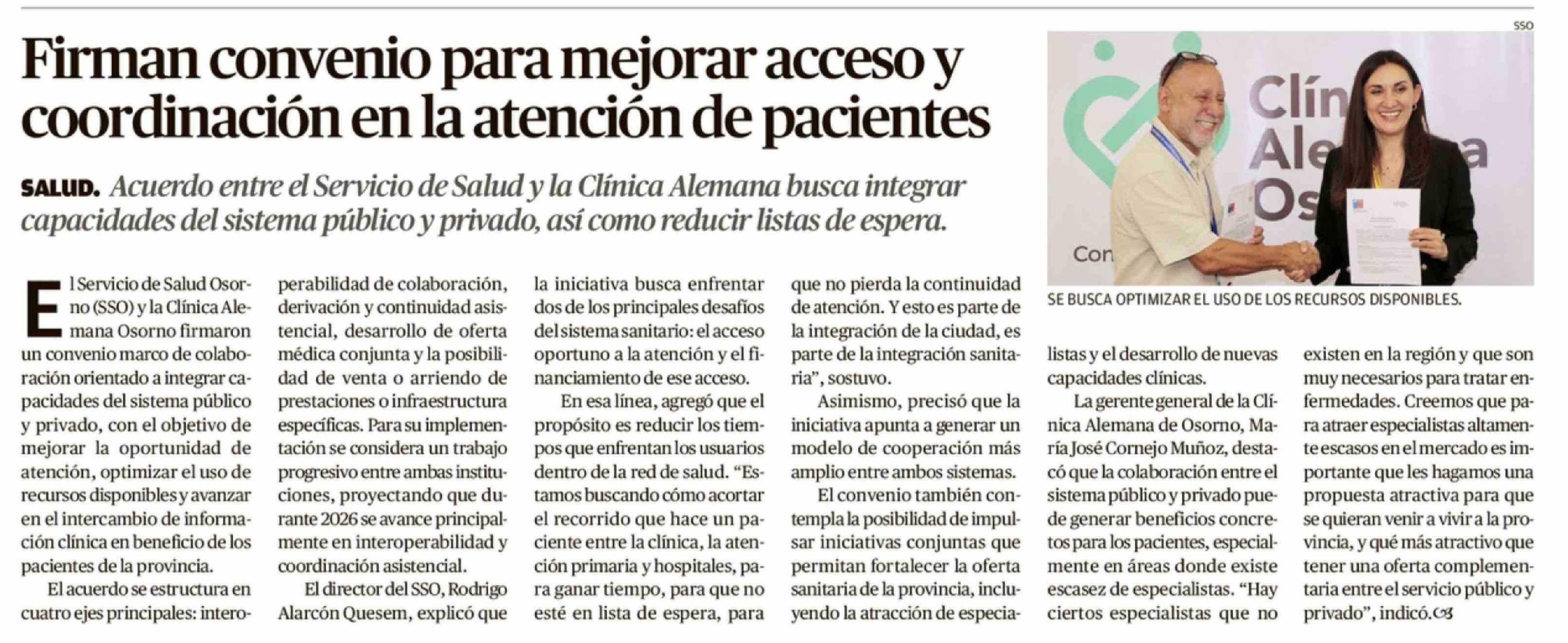 Firman convenio para mejorar acceso y coordinación en la atención de pacientes 15-03-2026 El Austral de Osorno |