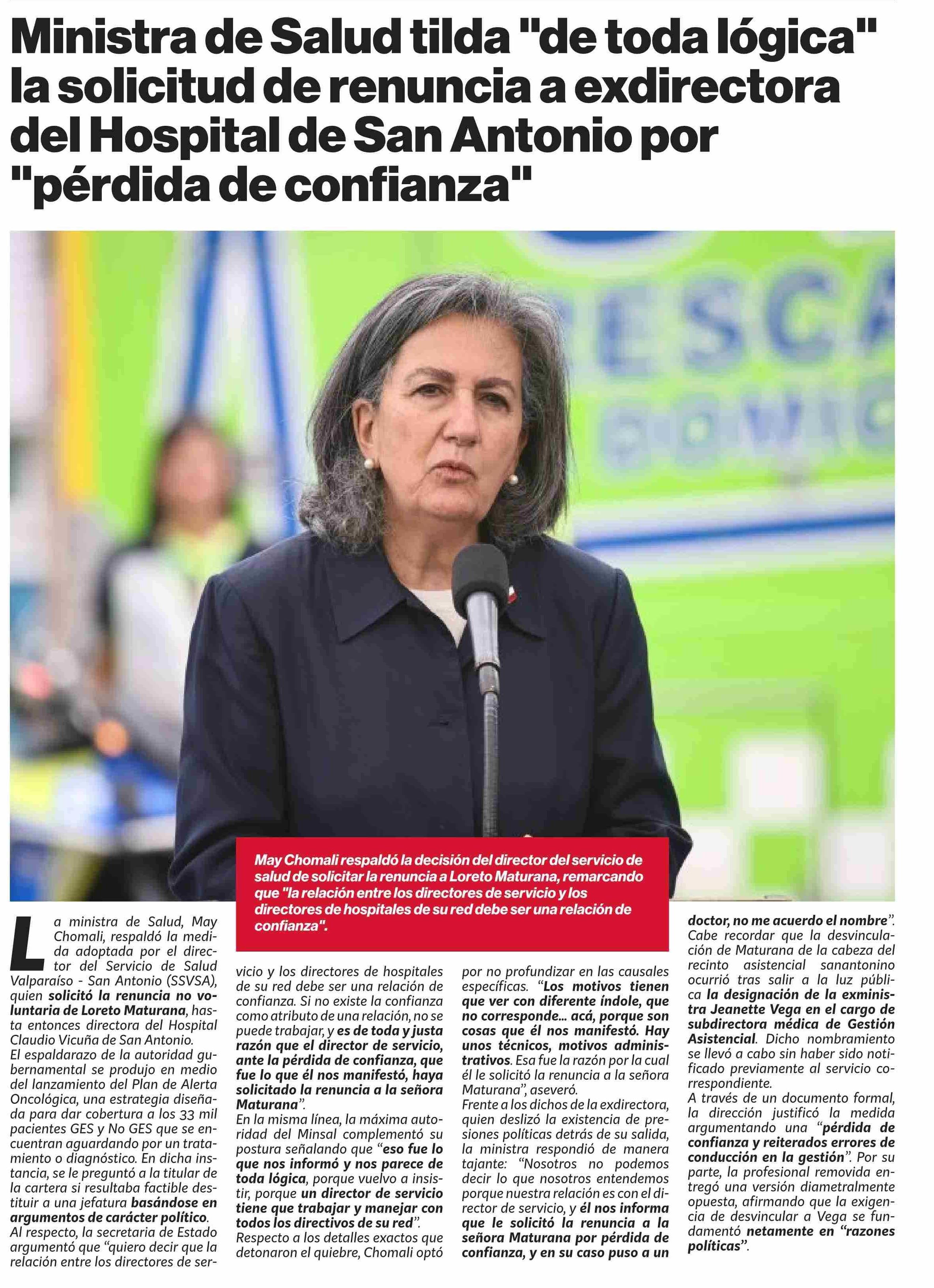 Ministra de Salud tilda "de toda lógica" la solicitud de renuncia a exdirectora del Hospital de San Antonio por "pérdida de confianza” 28-04-2026 Puranoticia.cl |