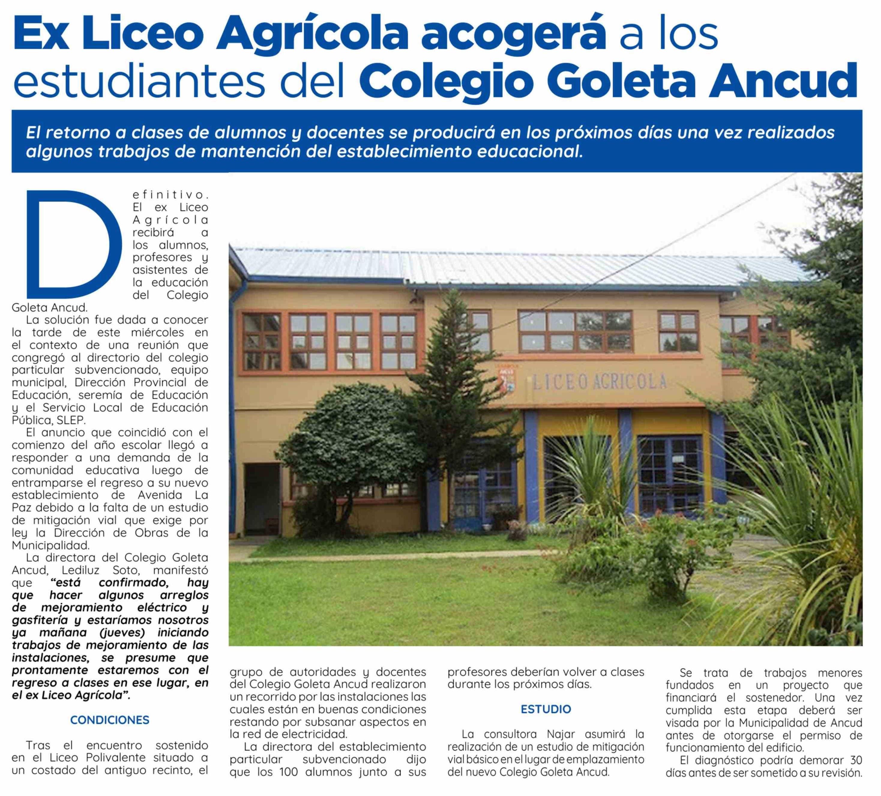 | Título: | Ex Liceo Agrícola acogerá a los estudiantes del Colegio Goleta Ancud |