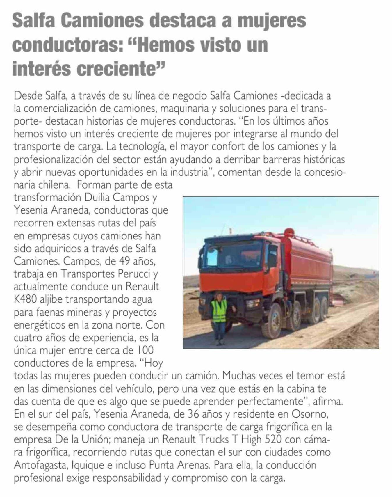| Título: | Salfa Camiones destaca a mujeres conductoras: "Hemos visto un interés creciente" |