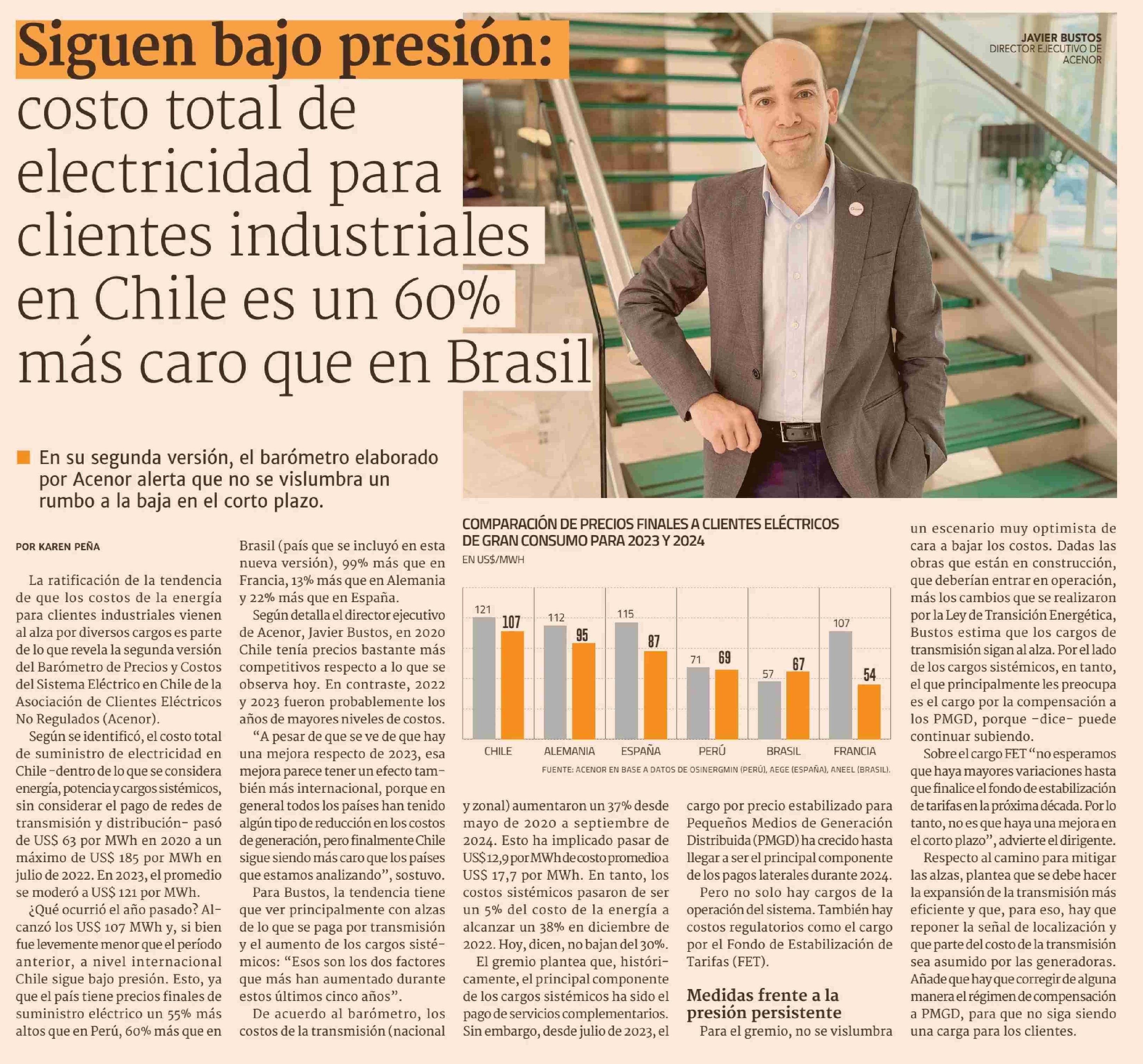 Siguen bajo presión: costo total de electricidad para clientes industriales en Chile es un 60% más caro que en Brasil 20-05-2025 Diario Financiero |