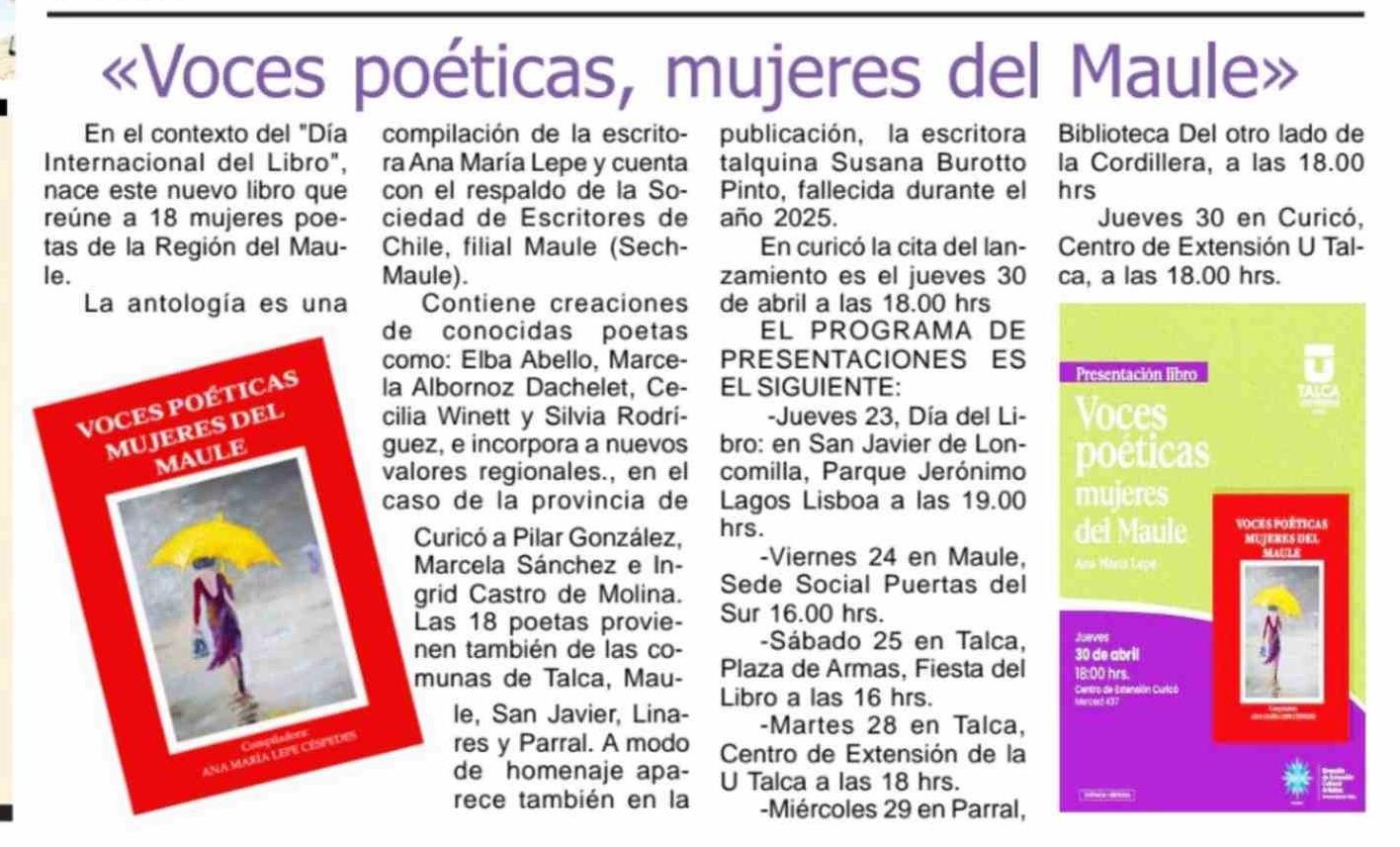 «Voces poéticas, mujeres del Maule» 26-04-2026 Maule Hoy |