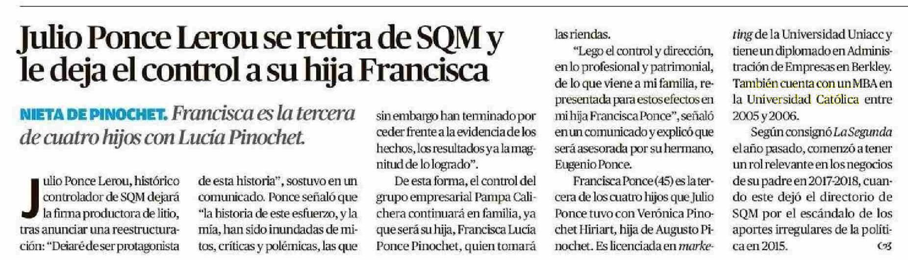 Julio Ponce Lerou se retira de SOM y le deja el control a su hija Francisca 06-06-2025 El Mercurio de Valparaíso |