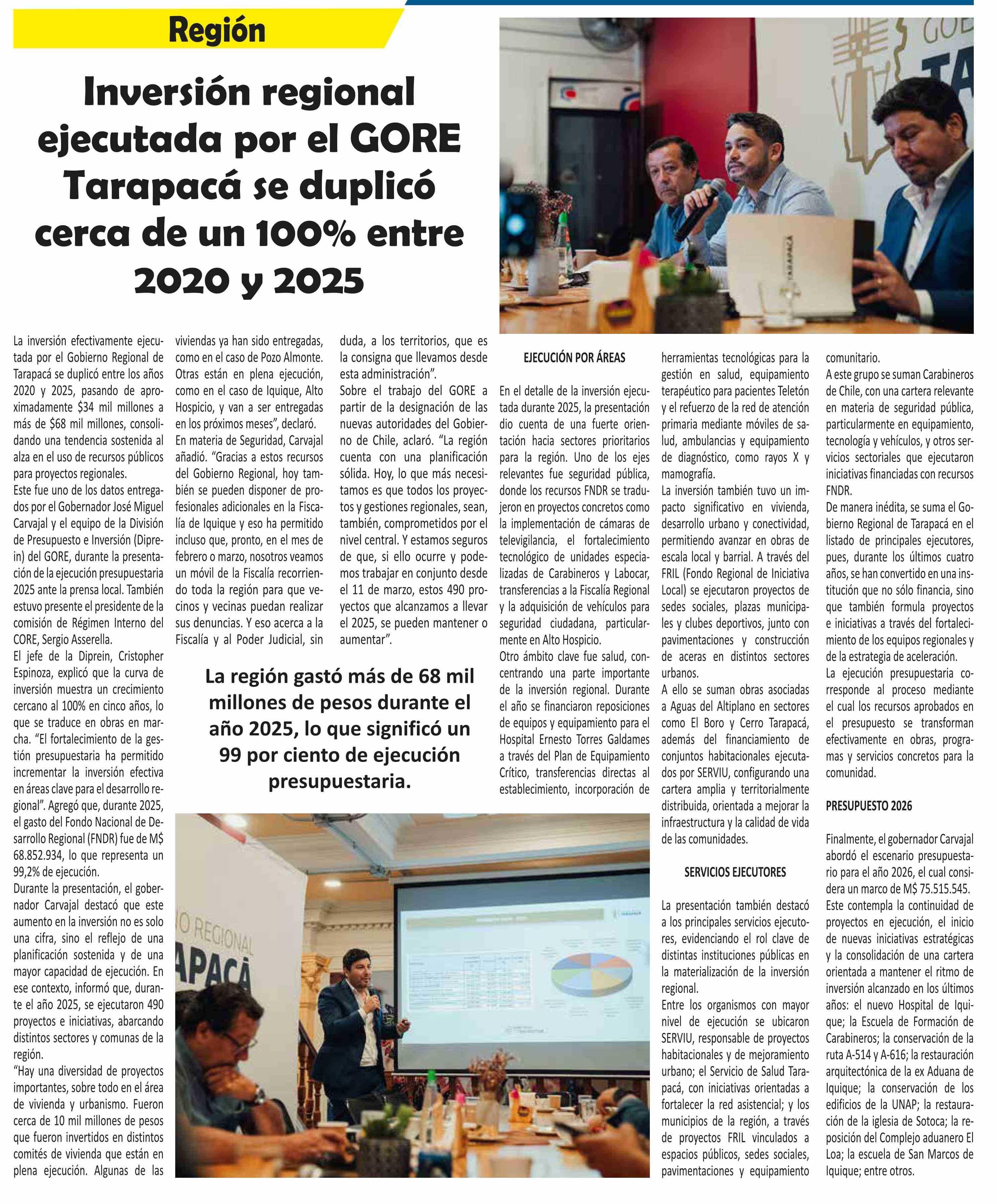 Título: Inversión regional ejecutada por el GORE Tarapacá se duplicó cerca de un 100% entre 2020 y 2025