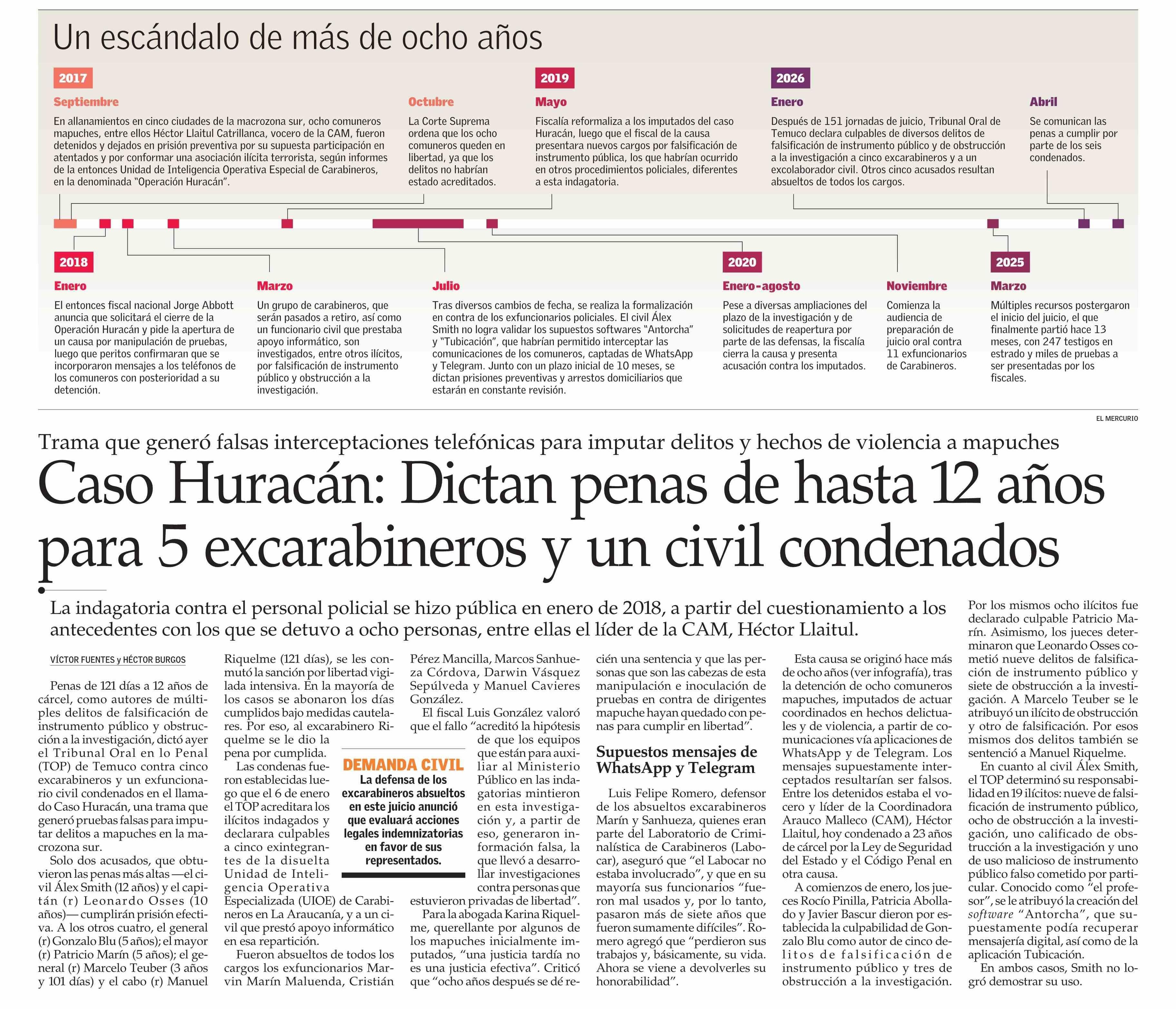Caso Huracán: Dictan penas de hasta 12 años para 5 excarabineros y un civil condenados 03-04-2026 El Mercurio |