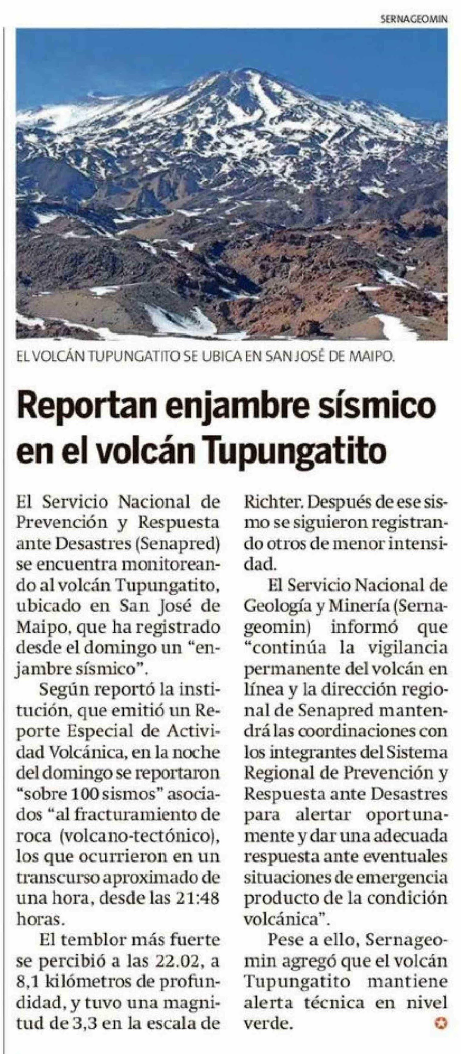 | Título: | Reportan enjambre sísmico en el volcan Tupungatito |