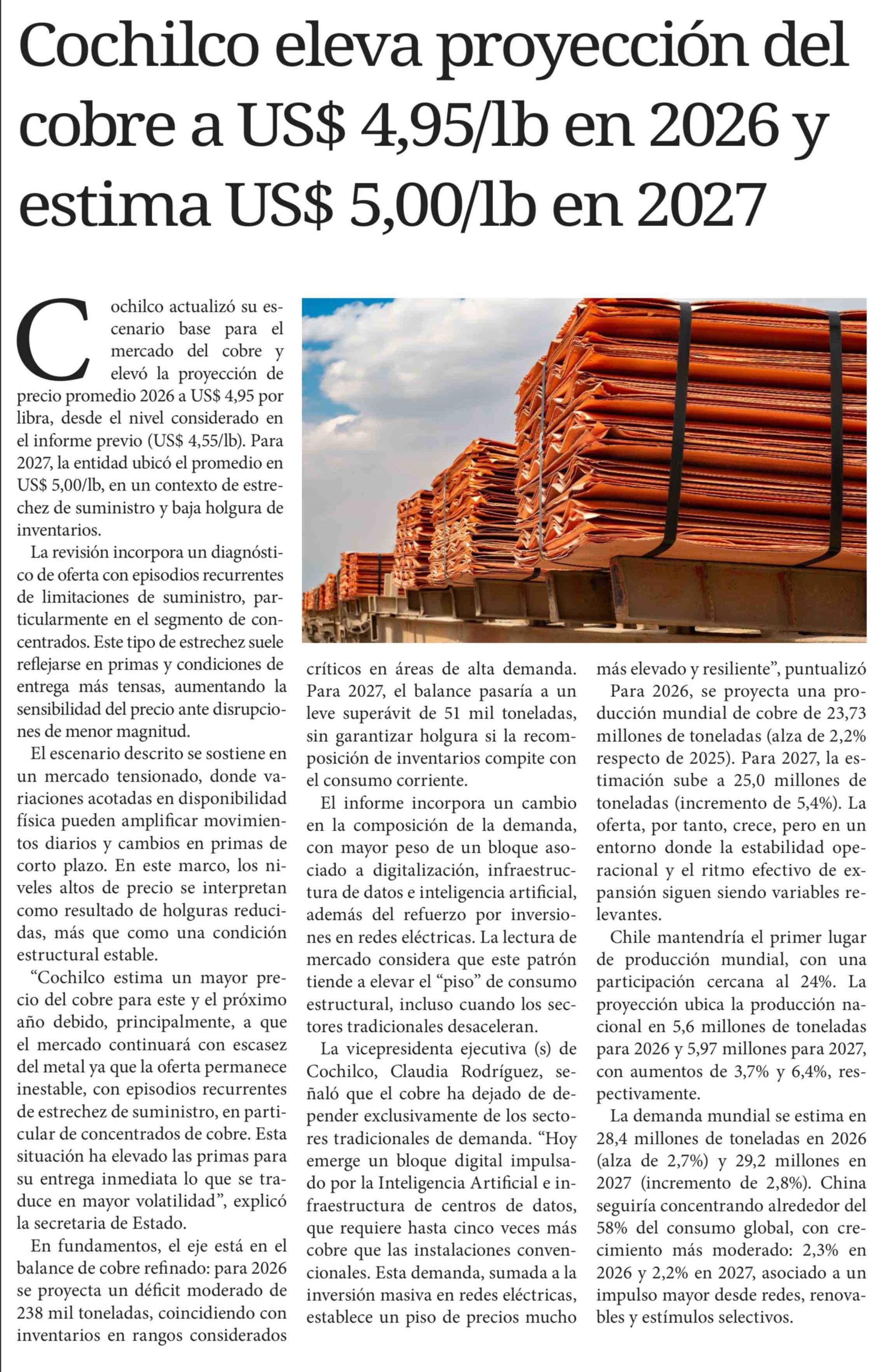 | Título: | Cochilco eleva proyección del cobre a US$ 4,95/1b en 2026 y estima US$ 5,00/lb en 2027 |