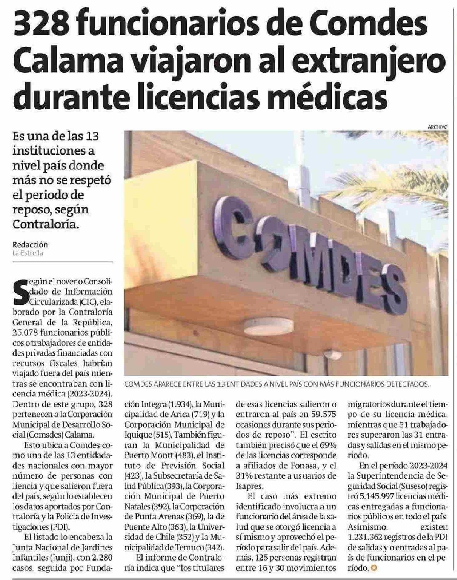 328 funcionarios de Comdes Calama viajaron al extranjero durante licencias médicas 21-05-2025 La Estrella de Antofagasta |