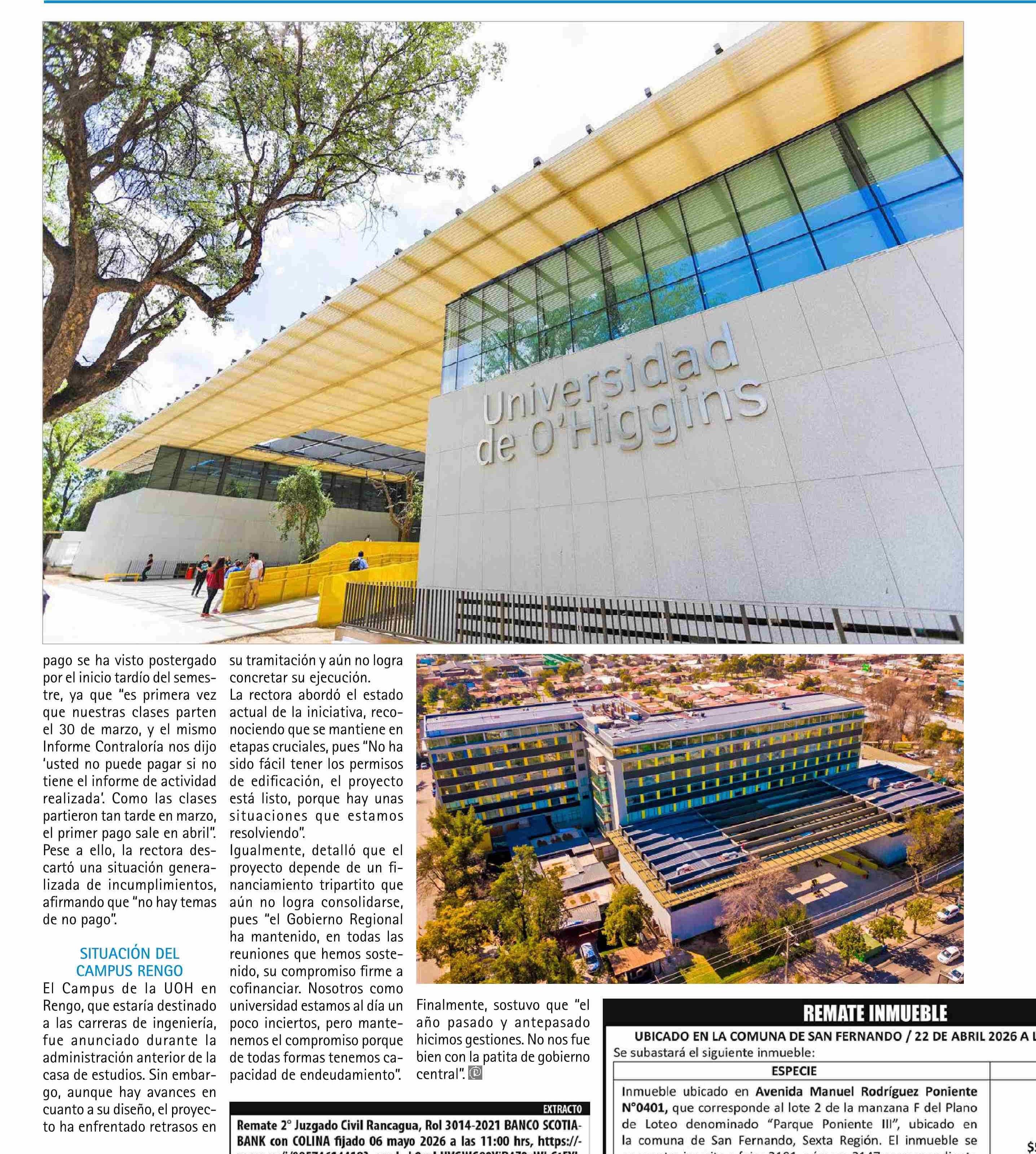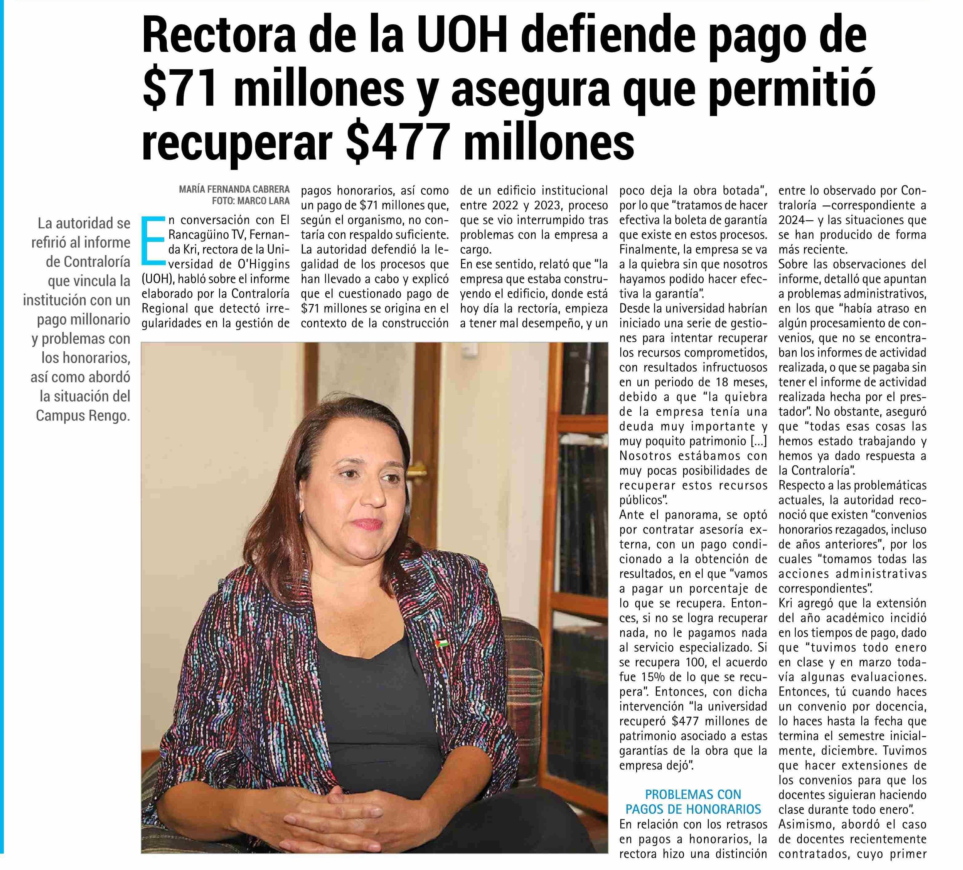 Rectora de la UOH defiende pago de $71 millones y asegura que permitió recuperar $477 millones 17-04-2026 El Rancagüino |
