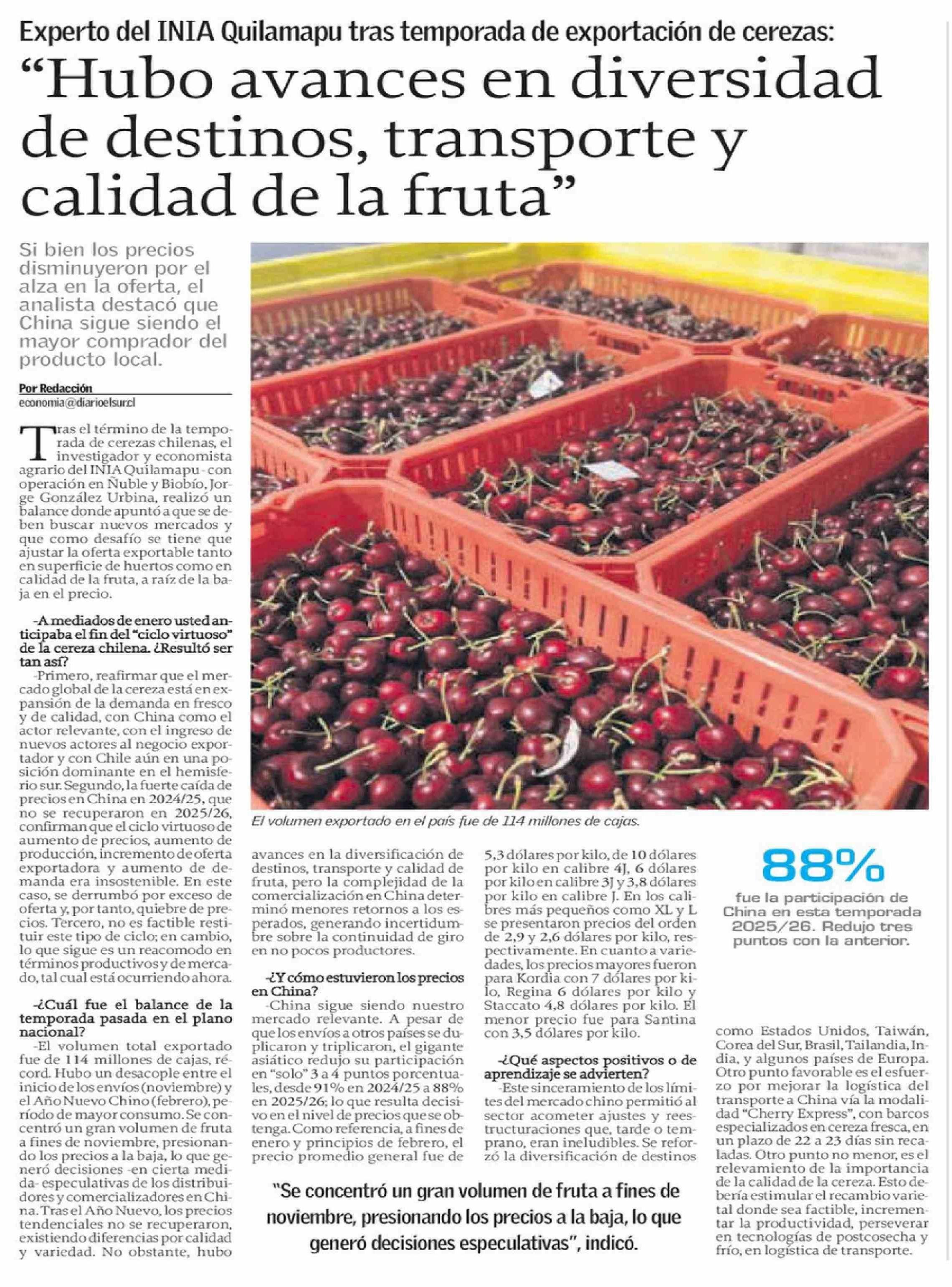 "Hubo avances en diversidad de destinos, transporte y calidad de la fruta" 16-04-2026 El Sur |