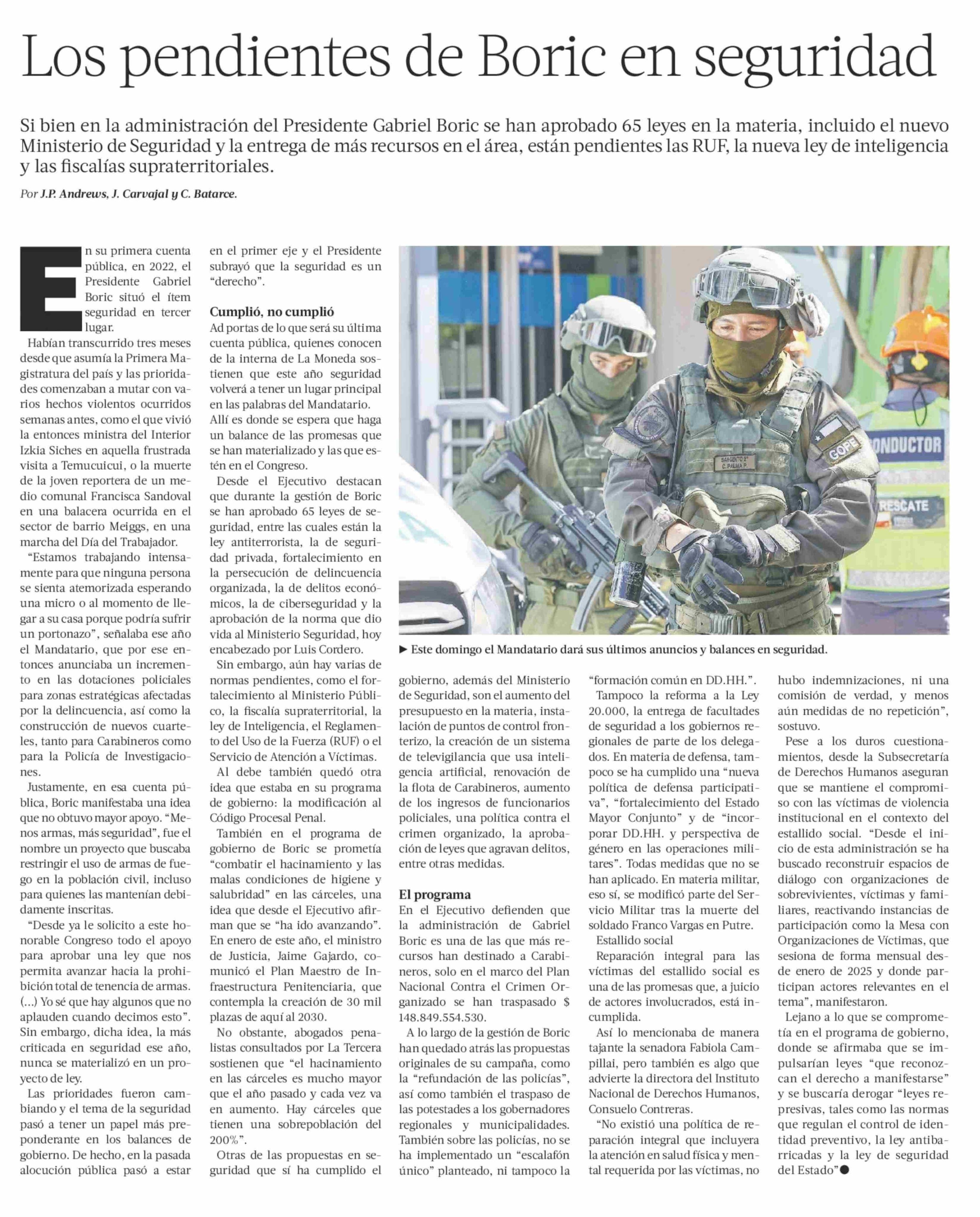 Los pendientes de Boric en seguridad 31-05-2025 La Tercera |